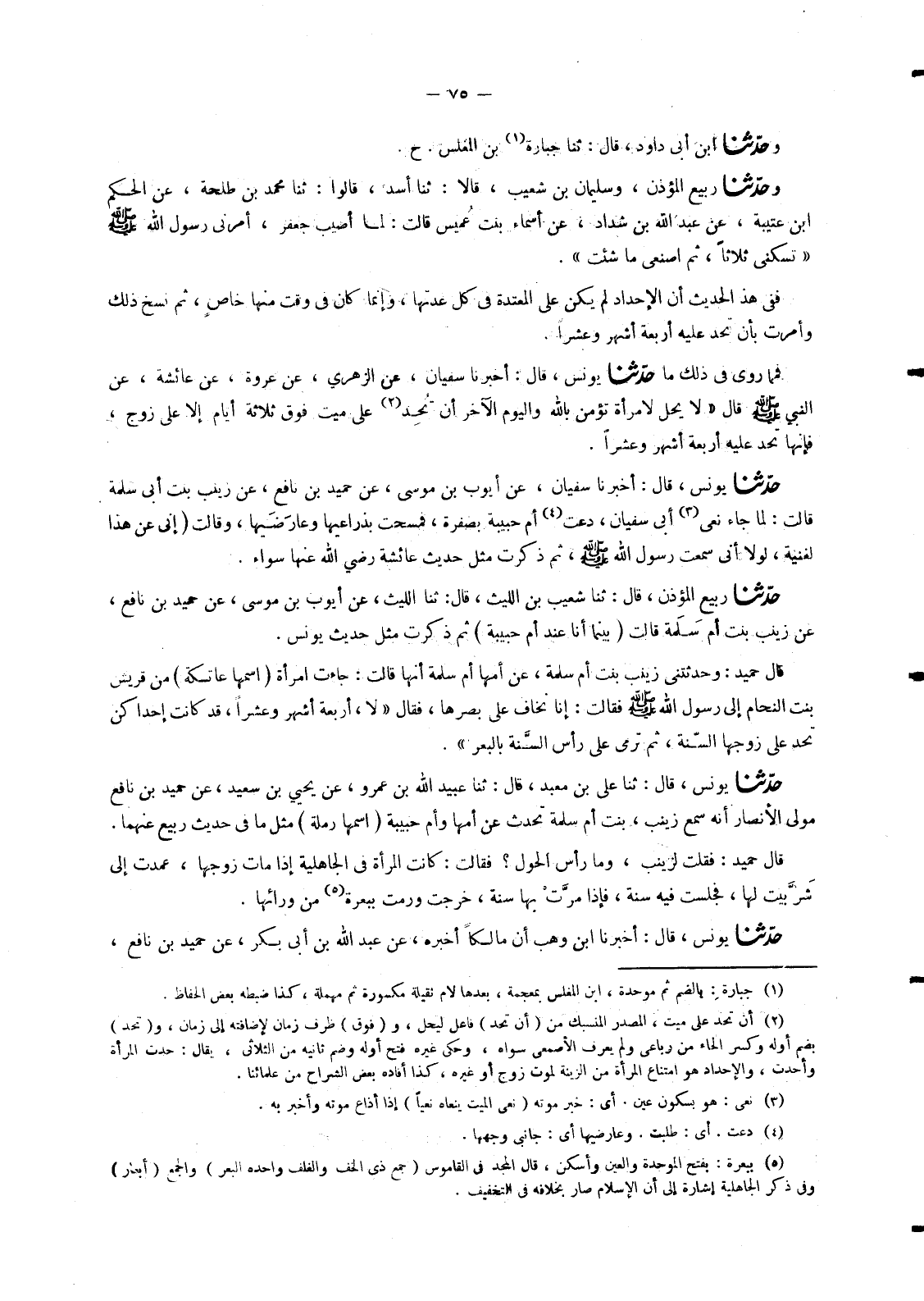 4548 - حَدَّثَنَا يُونُسُ , قَالَ أَخْبَرَنَا سُفْيَانُ , عَنْ أَيُّوبَ بْنِ مُوسَى , عَنْ حُمَيْدِ بْنِ نَافِعٍ , عَنْ زَيْنَبَ بِنْتِ أَبِي سَلَمَةَ , قَالَتْ: لَمَّا جَاءَ نَعْيُ أَبِي سُفْيَانَ , دَعَتْ أُمُّ حَبِيبَةَ بِصُفْرَةٍ , فَمَسَحَتْ بِذِرَاعَيْهَا وَعَارِضَيْهَا , وَقَالَتْ: «إِنِّي عَنْ هَذَا لَغَنِيَّةٌ , لَوْلَا أَنِّي سَمِعْتُ رَسُولَ اللهِ صَلَّى اللَّهُ عَلَيْهِ وَسَلَّمَ» , ثُمَّ ذَكَرَتْ مِثْلَ حَدِيثِ عَائِشَةَ رَضِيَ اللهُ عَنْهَا سَوَاءً.