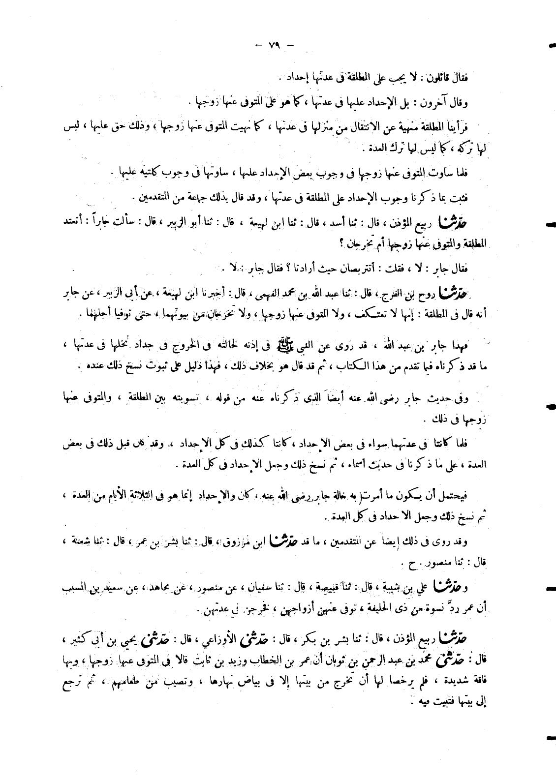 4580 - حَدَّثَنَا رَوْحُ بْنُ الْفَرَجِ , قَالَ: ثنا عَبْدُ اللهِ بْنُ مُحَمَّدٍ الْفَهْمِيُّ , قَالَ أَخْبَرَنَا ابْنُ لَهِيعَةَ , عَنْ أَبِي الزُّبَيْرِ , عَنْ جَابِرٍ , أَنَّهُ قَالَ فِي الْمُطَلَّقَةِ: «§إِنَّهَا لَا تَعْتَكِفُ , وَلَا الْمُتَوَفَّى عَنْهَا زَوْجُهَا , وَلَا تَخْرُجَانِ مِنْ بُيُوتِهِمَا , حَتَّى تُوُفِّيَا أَجَلَهُمَا» . فَهَذَا جَابِرُ بْنُ عَبْدِ اللهِ , قَدْ رَوَى عَنِ النَّبِيِّ صَلَّى اللَّهُ عَلَيْهِ وَسَلَّمَ فِي إِذْنِهِ لِخَالَتِهِ فِي الْخُرُوجِ فِي جِدَادِ نَخْلِهَا فِي عِدَّتِهَا , مَا قَدْ ذَكَرْنَاهُ فِيمَا تَقَدَّمَ مِنْ هَذَا الْكِتَابِ , ثُمَّ قَدْ قَالَ هُوَ بِخِلَافِ ذَلِكَ , فَهَذَا دَلِيلٌ عَلَى ثُبُوتِ نَسْخِ ذَلِكَ عِنْدَهُ. وَفِي حَدِيثِ جَابِرٍ رَضِيَ اللهُ عَنْهُ أَيْضًا الَّذِي ذَكَرْنَاهُ عَنْهُ مِنْ قَوْلِهِ , تَسْوِيَتُهُ بَيْنَ الْمُطَلَّقَةِ , وَالْمُتَوَفَّى عَنْهَا زَوْجُهَا فِي ذَلِكَ. فَلَمَّا كَانَتَا فِي عِدَّتِهِمَا سَوَاءً فِي بَعْضِ الْإِحْدَادِ , كَانَتَا كَذَلِكَ فِي كُلِّ الْإِحْدَادِ , وَقَدْ كَانَ قَبْلَ ذَلِكَ فِي بَعْضِ الْعِدَّةِ , عَلَى مَا ذَكَرْنَا فِي حَدِيثِ أَسْمَاءَ , ثُمَّ نُسِخَ ذَلِكَ وَجُعِلَ الْإِحْدَادُ فِي كُلِّ الْعِدَّةِ. فَيَحْتَمِلُ أَنْ يَكُونَ مَا أُمِرَتْ بِهِ خَالَةُ جَابِرٍ رَضِيَ اللهُ عَنْهُ كَانَ , وَالْإِحْدَادُ إِنَّمَا هُوَ فِي الثَّلَاثَةِ الْأَيَّامِ مِنَ الْعِدَّةِ , ثُمَّ نُسِخَ ذَلِكَ وَجُعِلَ الْإِحْدَادُ فِي كُلِّ الْعِدَّةِ. وَقَدْ رُوِيَ فِي ذَلِكَ أَيْضًا عَنِ الْمُتَقَدِّمِينَ , مَا قَدْ