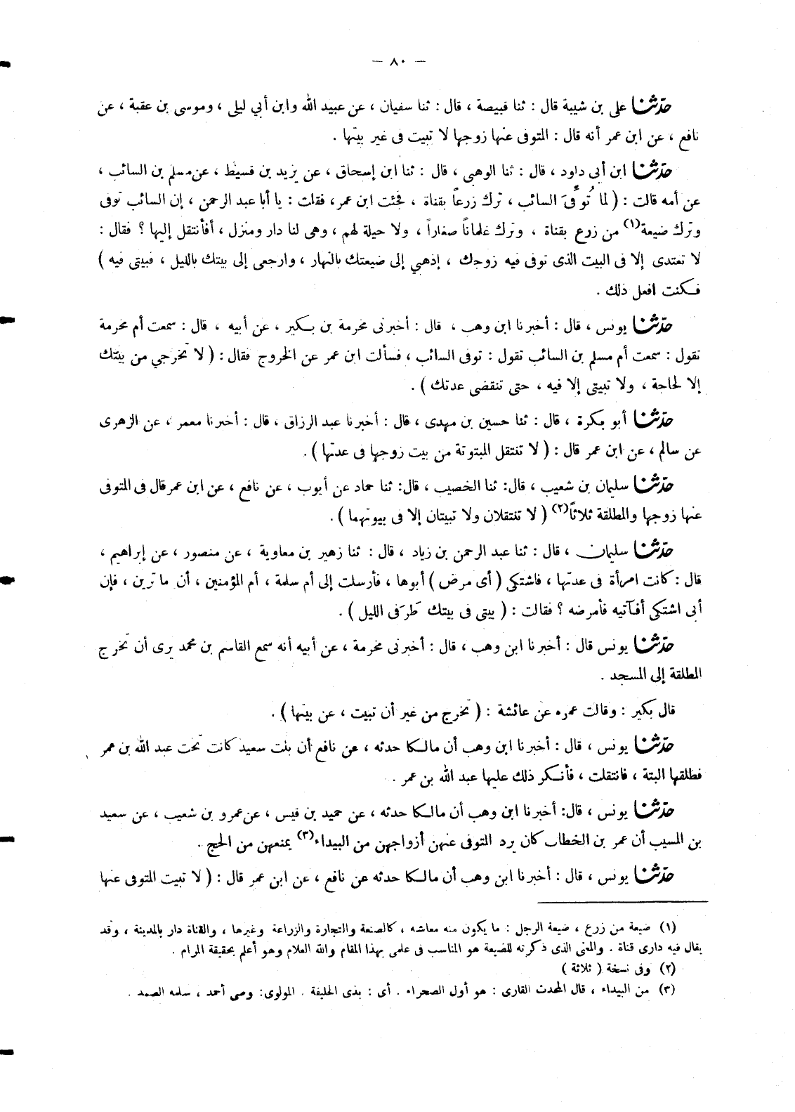 4586 - حَدَّثَنَا يُونُسُ , قَالَ أَخْبَرَنَا ابْنُ وَهْبٍ , قَالَ: أَخْبَرَنِي مَخْرَمَةُ بْنُ بُكَيْرٍ , عَنْ أَبِيهِ , قَالَ: سَمِعْتُ أُمَّ مَخْرَمَةَ , تَقُولُ: سَمِعْتُ أُمَّ مُسْلِمِ بْنِ السَّائِبِ , تَقُولُ: تُوُفِّيَ السَّائِبُ , فَسَأَلْتُ ابْنَ عُمَرَ عَنِ الْخُرُوجِ , فَقَالَ: «§لَا تَخْرُجِي مِنْ بَيْتِكِ إِلَّا لِحَاجَةٍ , وَلَا تَبِيتِي إِلَّا فِيهِ , حَتَّى تَنْقَضِيَ عِدَّتُكِ»