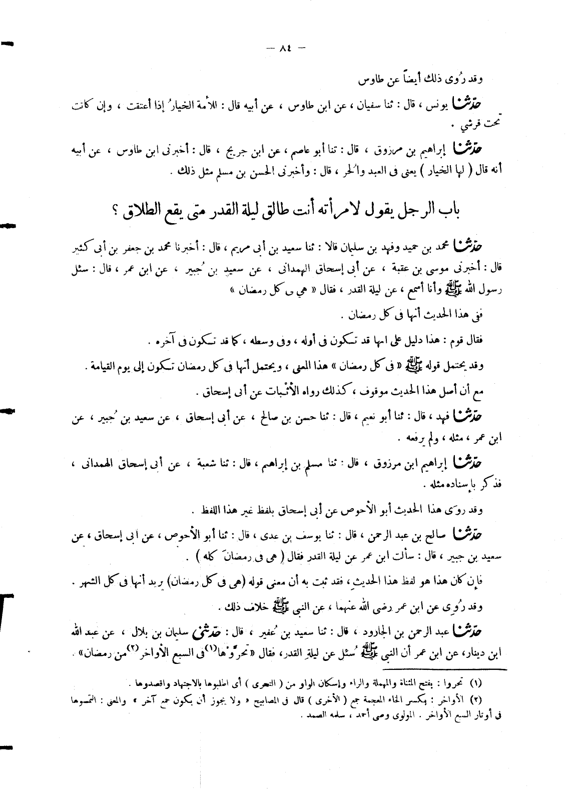 4610 - حَدَّثَنَا صَالِحُ بْنُ عَبْدِ الرَّحْمَنِ , قَالَ: ثنا يُوسُفُ بْنُ عَدِيٍّ , قَالَ: ثنا أَبُو الْأَحْوَصِ , عَنْ أَبِي إِسْحَاقَ , عَنْ سَعِيدِ بْنِ جُبَيْرٍ , قَالَ: سَأَلْتُ ابْنَ عُمَرَ عَنْ لَيْلَةِ الْقَدْرِ , فَقَالَ: «§هِيَ فِي رَمَضَانَ كُلِّهِ» . فَإِنْ كَانَ هَذَا هُوَ لَفْظُ هَذَا الْحَدِيثِ , فَقَدْ ثَبَتَ بِهِ أَنَّ مَعْنَى قَوْلِهِ «هِيَ فِي كُلِّ رَمَضَانَ» يُرِيدُ أَنَّهَا فِي كُلِّ الشَّهْرِ. وَقَدْ رُوِيَ عَنِ ابْنِ عُمَرَ رَضِيَ اللهُ عَنْهُمَا , عَنِ النَّبِيِّ صَلَّى اللَّهُ عَلَيْهِ وَسَلَّمَ خِلَافُ ذَلِكَ