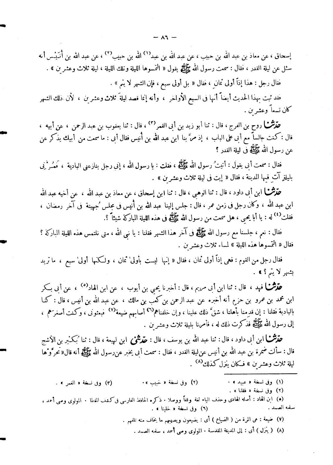 4622 - حَدَّثَنَا فَهْدٌ , قَالَ: ثنا ابْنُ أَبِي مَرْيَمَ , قَالَ: أَخْبَرَنَا يَحْيَى بْنُ أَيُّوبَ , عَنِ ابْنِ الْهَادِ , عَنْ أَبِي بَكْرِ بْنِ مُحَمَّدِ بْنِ عَمْرِو بْنِ حَزْمٍ أَنَّهُ أَخْبَرَهُ , عَنْ عَبْدِ الرَّحْمَنِ بْنِ كَعْبِ بْنِ مَالِكٍ , عَنْ " عَبْدِ اللهِ بْنِ أُنَيْسٍ , قَالَ: كُنَّا بِالْبَادِيَةِ فَقُلْنَا: إِنْ قَدِمْنَا بِأَهْلِنَا , شَقَّ ذَلِكَ عَلَيْنَا , وَإِنْ خَلَّفْنَاهُمْ أَصَابَهُمْ ضَيْعَةٌ فَبَعَثُونِي , وَكُنْتُ أَصْغَرَهُمْ , إِلَى رَسُولِ اللهِ صَلَّى اللَّهُ عَلَيْهِ وَسَلَّمَ فَذَكَرْتُ ذَلِكَ لَهُ , §فَأَمَرَنَا بِلَيْلَةِ ثَلَاثٍ وَعِشْرِينَ "