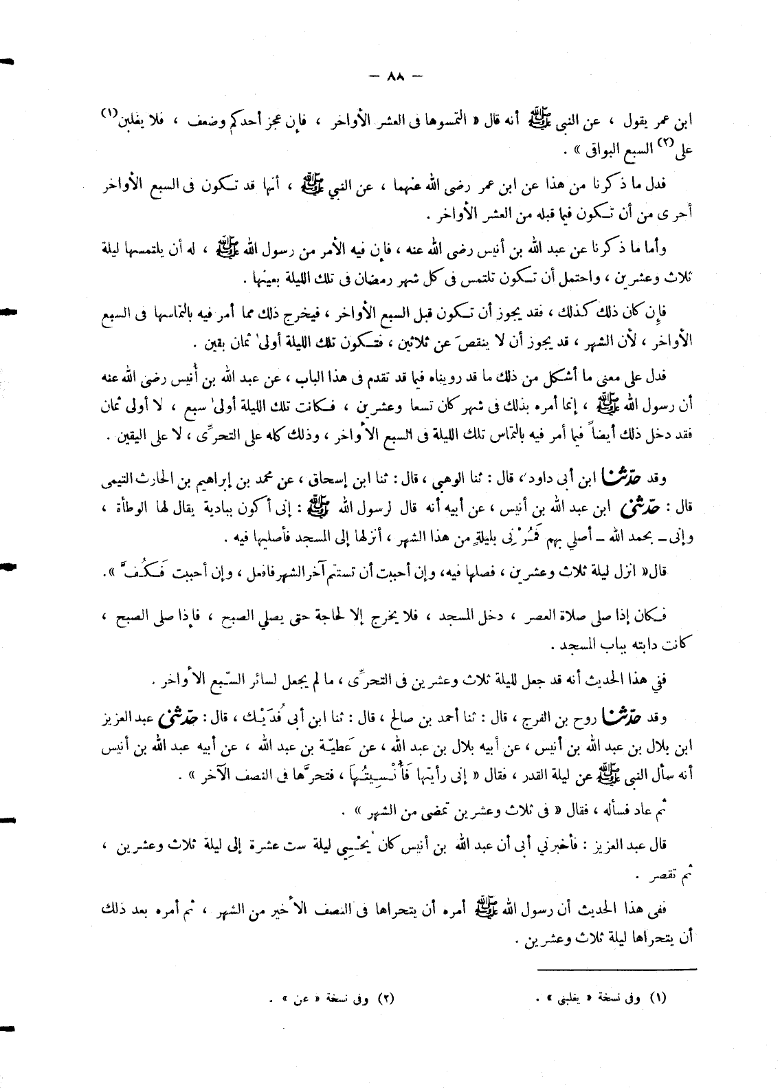 4629 - حَدَّثَنَا رَوْحُ بْنُ الْفَرَجِ , قَالَ: ثنا أَحْمَدُ بْنُ صَالِحٍ , قَالَ: ثنا ابْنُ أَبِي فُدَيْكٍ , قَالَ: حَدَّثَنِي عَبْدُ الْعَزِيزِ بْنُ بِلَالِ بْنِ عَبْدِ اللهِ بْنِ أُنَيْسٍ , عَنْ أَبِيهِ بِلَالِ بْنِ عَبْدِ اللهِ , عَنْ عَطِيَّةَ بْنِ عَبْدِ اللهِ , عَنْ أَبِيهِ عَبْدِ اللهِ بْنِ أُنَيْسٍ , أَنَّهُ سَأَلَ النَّبِيَّ صَلَّى اللَّهُ عَلَيْهِ وَسَلَّمَ عَنْ لَيْلَةِ الْقَدْرِ , فَقَالَ: «§إِنِّي رَأَيْتُهَا فَأُنْسِيتُهَا , فَتَحَرَّهَا فِي النِّصْفِ الْآخَرِ» . ثُمَّ عَادَ فَسَأَلَهُ , فَقَالَ: «فِي ثَلَاثٍ وَعِشْرِينَ تَمْضِي مِنَ الشَّهْرِ» . قَالَ عَبْدُ الْعَزِيزِ: فَأَخْبَرَنِي أَبِي: أَنَّ عَبْدَ اللهِ بْنَ أُنَيْسٍ كَانَ يُحْيِي لَيْلَةَ سِتَّ عَشْرَةَ إِلَى لَيْلَةِ ثَلَاثٍ وَعِشْرِينَ , ثُمَّ تُقْصَرُ. فَفِي هَذَا الْحَدِيثِ أَنَّ رَسُولَ اللهِ صَلَّى اللَّهُ عَلَيْهِ وَسَلَّمَ أَمَرَهُ أَنْ يَتَحَرَّاهَا فِي النِّصْفِ الْأَخِيرِ مِنَ الشَّهْرِ , ثُمَّ أَمَرَهُ بَعْدَ ذَلِكَ أَنْ يَتَحَرَّاهَا لَيْلَةَ ثَلَاثٍ وَعِشْرِينَ. -[89]- فَقَدْ رَجَعَ مَعْنَى هَذَا الْحَدِيثِ إِلَى مَعْنَى مَا رَوَيْنَا قَبْلَهُ عَنْ عَبْدِ اللهِ بْنِ أُنَيْسٍ رَضِيَ اللهُ عَنْهُ. وَقَدْ يَجُوزُ أَنْ يَكُونَ رَسُولُ اللهِ صَلَّى اللَّهُ عَلَيْهِ وَسَلَّمَ إِنَّمَا أَمَرَ عَبْدَ اللهِ بْنَ أُنَيْسٍ بِتَحَرِّي لَيْلَةِ الْقَدْرِ فِي اللَّيْلَةِ الَّتِي ذَكَرْنَا , عَلَى أَنَّ تَحَرِّيَهُ ذَلِكَ إِنَّمَا تَكُونُ فِي تِلْكَ السَّنَةِ كَذَلِكَ لِرُؤْيَاهُ الَّتِي كَانَ رَآهَا النَّبِيُّ صَلَّى اللَّهُ عَلَيْهِ وَسَلَّمَ , وَإِنْ كَانَتْ قَدْ تَكُونُ فِي غَيْرِهَا مِنَ السِّنِينَ بِخِلَافِ ذَلِكَ فَأَمَّا مَا رُوِيَ عَنْهُ فِي رُؤْيَاهُ الَّتِي كَانَ رَآهَا , مِمَّا قَدْ ذَكَرْنَاهَا عَنْهُ فِي حَدِيثِ بِشْرِ بْنِ سَعِيدٍ , عَنْ عَبْدِ اللهِ بْنِ أُنَيْسٍ رَضِيَ اللهُ عَنْهُ , فَقَدْ رُوِيَ عَنْ أَبِي سَعِيدٍ , عَنِ النَّبِيِّ , صَلَّى اللَّهُ عَلَيْهِ وَسَلَّمَ , خِلَافُ ذَلِكَ