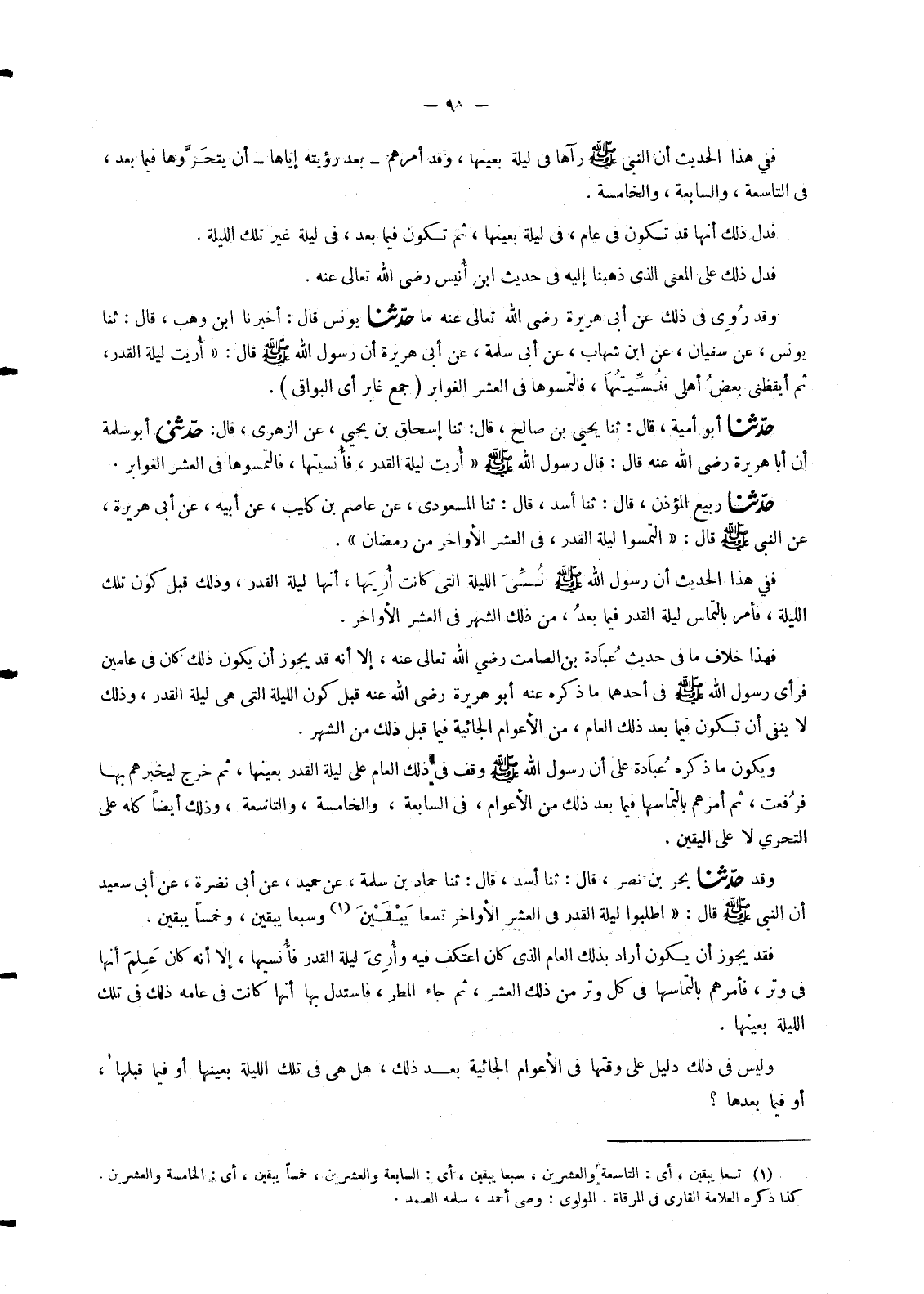 4636 - حَدَّثَنَا بَحْرُ بْنُ نَصْرٍ , قَالَ: ثنا أَسَدٌ , قَالَ: ثنا حَمَّادُ بْنُ سَلَمَةَ , عَنْ حُمَيْدٍ , عَنْ أَبِي نَضْرَةَ , عَنْ أَبِي سَعِيدٍ , أَنَّ النَّبِيَّ صَلَّى اللَّهُ عَلَيْهِ وَسَلَّمَ قَالَ: «§اطْلُبُوا لَيْلَةَ الْقَدْرِ فِي الْعَشْرِ الْأَوَاخِرِ , تِسْعًا يَبْقَيْنَ , وَسَبْعًا يَبْقَيْنَ , وَخَمْسًا يَبْقَيْنَ» . فَقَدْ يَجُوزُ أَنْ يَكُونَ أَرَادَ بِذَلِكَ الْعَامَ الَّذِي كَانَ اعْتَكَفَ فِيهِ وَأُرِيَ لَيْلَةَ الْقَدْرِ فَأُنْسِيهَا , إِلَّا أَنَّهُ كَانَ عَلِمَ أَنَّهَا فِي وِتْرٍ , فَأَمَرَهُمْ بِالْتِمَاسِهَا فِي كُلِّ وِتْرٍ مِنْ ذَلِكَ الْعَشْرِ , ثُمَّ جَاءَ الْمَطَرُ , فَاسْتَدَلَّ بِهَا أَنَّهَا كَانَتْ فِي عَامِهِ ذَلِكَ فِي تِلْكَ اللَّيْلَةِ بِعَيْنِهَا. وَلَيْسَ فِي ذَلِكَ دَلِيلٌ عَلَى وَقْتِهَا فِي الْأَعْوَامِ الْجَائِيَةِ بَعْدَ ذَلِكَ , هَلْ هِيَ فِي تِلْكَ اللَّيْلَةِ بِعَيْنِهَا أَوْ فِيمَا قَبْلَهَا , أَوْ فِيمَا بَعْدَهَا؟ -[91]- وَقَدْ يَجُوزُ أَيْضًا أَنْ يَكُونَ مَا حَكَاهُ أَبُو نَضْرَةَ فِي هَذَا عَنْ أَبِي سَعِيدٍ عَنِ النَّبِيِّ صَلَّى اللَّهُ عَلَيْهِ وَسَلَّمَ هُوَ الْأَعْوَامُ كُلُّهَا. فَيَعُودُ مَعْنَى ذَلِكَ إِلَى مَعْنَى مَا رَوَيْنَاهُ مُتَقَدِّمًا فِي هَذَا الْبَابِ عَنِ ابْنِ عُمَرَ رَضِيَ اللهُ عَنْهُمَا , إِلَّا أَنَّ فِي حَدِيثِ أَبِي سَعِيدٍ رَضِيَ اللهُ عَنْهُ زِيَادَةُ مَعْنًى وَاحِدٍ , وَهُوَ إِنَّمَا تَكُونُ فِي الْوِتْرِ مِنْ ذَلِكَ. وَقَدْ