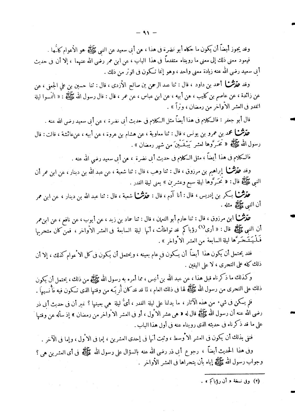 4641 - حَدَّثَنَا ابْنُ مَرْزُوقٍ , قَالَ: ثنا عَارِمٌ أَبُو النُّعْمَانِ , قَالَ: ثنا حَمَّادُ بْنُ زَيْدٍ , عَنْ أَيُّوبَ , عَنْ نَافِعٍ , عَنِ ابْنِ عُمَرَ أَنَّ النَّبِيَّ صَلَّى اللَّهُ عَلَيْهِ وَسَلَّمَ قَالَ: «§أَرَى رُؤْيَاكُمْ قَدْ تَوَاطَأَتْ أَنَّهَا لَيْلَةُ السَّابِعَةِ فِي الْعَشْرِ الْأَوَاخِرِ , فَمَنْ كَانَ مُتَحَرِّيهَا فَلْيَتَحَرَّهَا لَيْلَةَ السَّابِعَةِ مِنَ الْعَشْرِ الْأَوَاخِرِ» . فَقَدْ يُحْتَمَلُ أَنْ يَكُونَ هَذَا أَيْضًا أَنْ يَكُونَ فِي عَامٍ بِعَيْنِهِ , وَيُحْتَمَلُ أَنْ يَكُونَ فِي كُلِّ الْأَعْوَامِ كَذَلِكَ , إِلَّا أَنَّ ذَلِكَ كُلَّهُ عَلَى التَّحَرِّي , لَا عَلَى الْيَقِينِ وَكَذَلِكَ مَا ذَكَرْنَاهُ قَبْلَ هَذَا , عَنْ عَبْدِ اللهِ بْنِ أُنَيْسٍ , مِمَّا أَمَرَهُ بِهِ رَسُولُ اللهِ صَلَّى اللَّهُ عَلَيْهِ وَسَلَّمَ مِنْ ذَلِكَ , يُحْتَمَلُ أَنْ يَكُونَ ذَلِكَ عَلَى التَّحَرِّي مِنْ رَسُولِ اللهِ صَلَّى اللَّهُ عَلَيْهِ وَسَلَّمَ لَهَا فِي ذَلِكَ الْعَامِ , لِمَا قَدْ كَانَ أُرِيَهُ مِنْ وَقْتِهَا الَّذِي تَكُونُ فِيهِ فَأُنْسِيهَا. فَلَمْ يَكُنْ فِي شَيْءٍ مِنْ هَذِهِ الْآثَارِ , مَا يَدُلُّنَا عَلَى لَيْلَةِ الْقَدْرِ أَيُّ لَيْلَةٍ هِيَ بِعَيْنِهَا؟ غَيْرَ أَنَّ فِي حَدِيثِ أَبِي ذَرٍّ رَضِيَ اللهُ عَنْهُ أَنَّ رَسُولَ اللهِ صَلَّى اللَّهُ عَلَيْهِ وَسَلَّمَ قَالَ لَهُ «هِيَ عَشْرُ الْأُوَلِ , أَوْ فِي الْعَشْرِ الْأَوَاخِرِ مِنْ رَمَضَانَ» إِذْ سَأَلَهُ عَنْ وَقْتِهَا عَلَى مَا قَدْ ذَكَرْنَاهُ فِي حَدِيثِهِ الَّذِي رَوَيْنَاهُ عَنْهُ فِي أَوَّلِ هَذَا الْبَابِ فَنَفَى بِذَلِكَ أَنْ يَكُونَ فِي الْعَشْرِ الْأَوْسَطِ , وَثَبَتَ أَنَّهَا فِي إِحْدَى الْعَشْرَيْنِ , إِمَّا فِي الْأُوَلِ , وَإِمَّا فِي الْآخَرِ. وَفِي هَذَا الْحَدِيثِ أَيْضًا , رُجُوعُ أَبِي ذَرٍّ رَضِيَ اللهُ عَنْهُ بِالسُّؤَالِ عَلَى رَسُولِ اللهِ صَلَّى اللَّهُ عَلَيْهِ وَسَلَّمَ فِي أَيِّ الْعَشْرَيْنِ هِيَ؟ وَجَوَابُ رَسُولِ اللهِ صَلَّى اللَّهُ عَلَيْهِ وَسَلَّمَ إِيَّاهُ بِأَنْ يَتَحَرَّاهَا فِي الْعَشْرِ الْأَوَاخِرِ. -[92]- فَنَظَرْنَا فِيمَا رُوِيَ فِي غَيْرِهِمَا مِنَ الْآثَارِ , هَلْ فِيهِ مَا يَدُلُّ عَلَى أَنَّهَا فِي لَيْلَةٍ مِنْ هَذَيْنِ الْعَشْرَيْنِ بِعَيْنِهَا؟ فَإِذَا