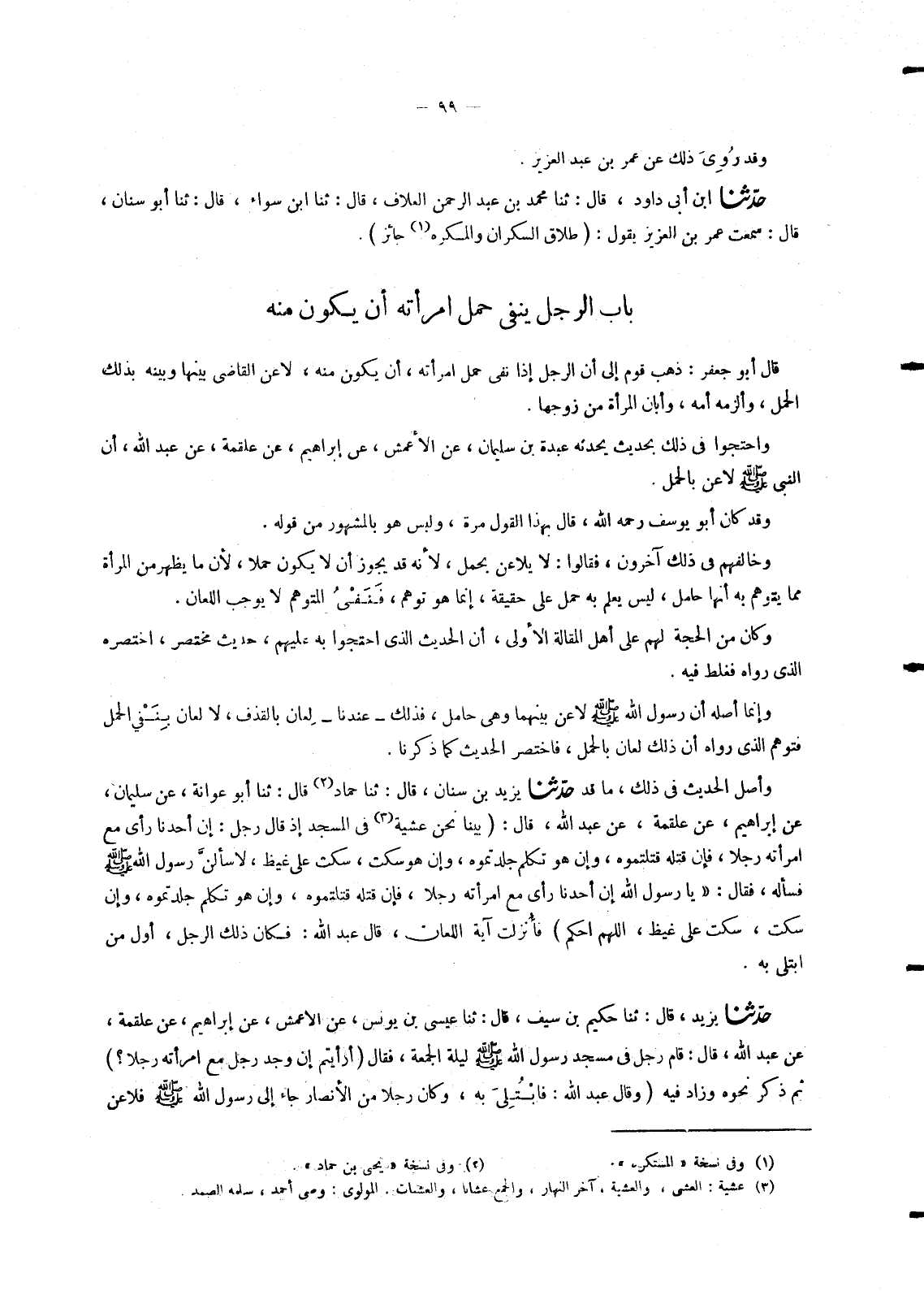 يُحَدِّثُهُ عَبْدَةُ بْنُ سُلَيْمَانَ , عَنِ الْأَعْمَشِ , عَنْ إِبْرَاهِيمَ , عَنْ عَلْقَمَةَ , عَنْ عَبْدِ اللهِ , «§أَنَّ النَّبِيَّ صَلَّى اللَّهُ عَلَيْهِ وَسَلَّمَ لَاعَنَ بِالْحَمْلِ» . وَقَدْ كَانَ أَبُو يُوسُفَ رَحِمَهُ اللهُ , قَالَ بِهَذَا الْقَوْلِ مَرَّةً , وَلَيْسَ هُوَ بِالْمَشْهُورِ مِنْ قَوْلِهِ. وَخَالَفَهُمْ فِي ذَلِكَ آخَرُونَ , فَقَالُوا: لَا يُلَاعِنُ بِحَمْلٍ , لِأَنَّهُ قَدْ يَجُوزُ أَنْ لَا يَكُونَ حَمْلًا , لِأَنَّ مَا يَظْهَرُ مِنَ الْمَرْأَةِ مِمَّا يُتَوَهَّمُ بِهِ أَنَّهَا حَامِلٌ , لَيْسَ يُعْلَمُ بِهِ حَمْلٌ عَلَى حَقِيقَةٍ , إِنَّمَا هُوَ تَوَهُّمٌ , فَنَفْيُ الْمُتَوَهَّمِ لَا يُوجِبُ اللِّعَانَ , وَكَانَ مِنَ الْحُجَّةِ لَهُمْ عَلَى أَهْلِ الْمَقَالَةِ الْأُولَى , أَنَّ الْحَدِيثَ الَّذِي احْتَجُّوا بِهِ عَلَيْهِمْ , حَدِيثٌ مُخْتَصَرٌ , اخْتَصَرَهُ الَّذِي رَوَاهُ فَغَلِطَ فِيهِ وَإِنَّمَا أَصْلُهُ «أَنَّ رَسُولَ اللهِ صَلَّى اللَّهُ عَلَيْهِ وَسَلَّمَ لَاعَنَ بَيْنَهُمَا وَهِيَ حَامِلٌ» , فَذَلِكَ - عِنْدَنَا - لِعَانٌ بِالْقَذْفِ , لَا لِعَانٌ بِنَفْيِ الْحَمْلِ , فَتَوَهَّمَ الَّذِي رَوَاهُ أَنَّ ذَلِكَ لِعَانٌ بِالْحَمْلِ , فَاخْتَصَرَ الْحَدِيثَ كَمَا ذَكَرْنَا وَأَصْلُ الْحَدِيثِ فِي ذَلِكَ , مَا قَدْ