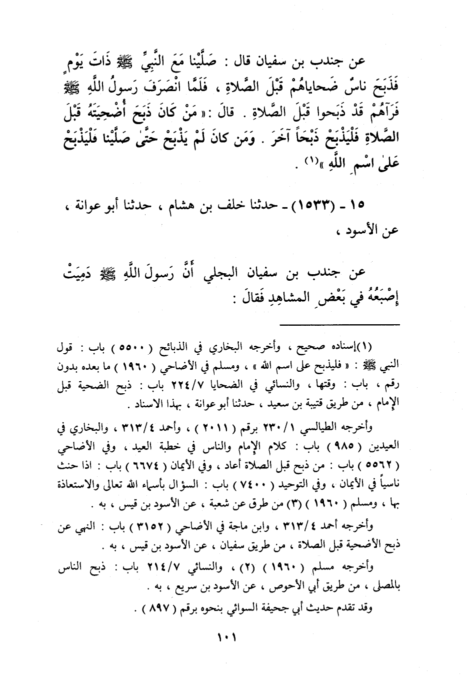 1533 - حَدَّثَنَا خَلَفُ بْنُ هِشَامٍ، حَدَّثَنَا أَبُو عَوَانَةَ، عَنِ الْأَسْوَدِ، عَنْ جُنْدُبِ بْنِ سُفْيَانَ الْبَجَلِيِّ، أَنَّ رَسُولَ اللَّهِ صَلَّى اللهُ عَلَيْهِ وَسَلَّمَ دَمِيَتْ إِصْبَعُهُ فِي بَعْضِ الْمَشَاهِدِ، فَقَالَ: «§هَلْ أَنْتِ إِلَّا إِصْبَعٌ دَمِيتِ، وَفِي سَبِيلِ اللَّهِ مَا لَقِيتِ؟» Kإسناده صحيح