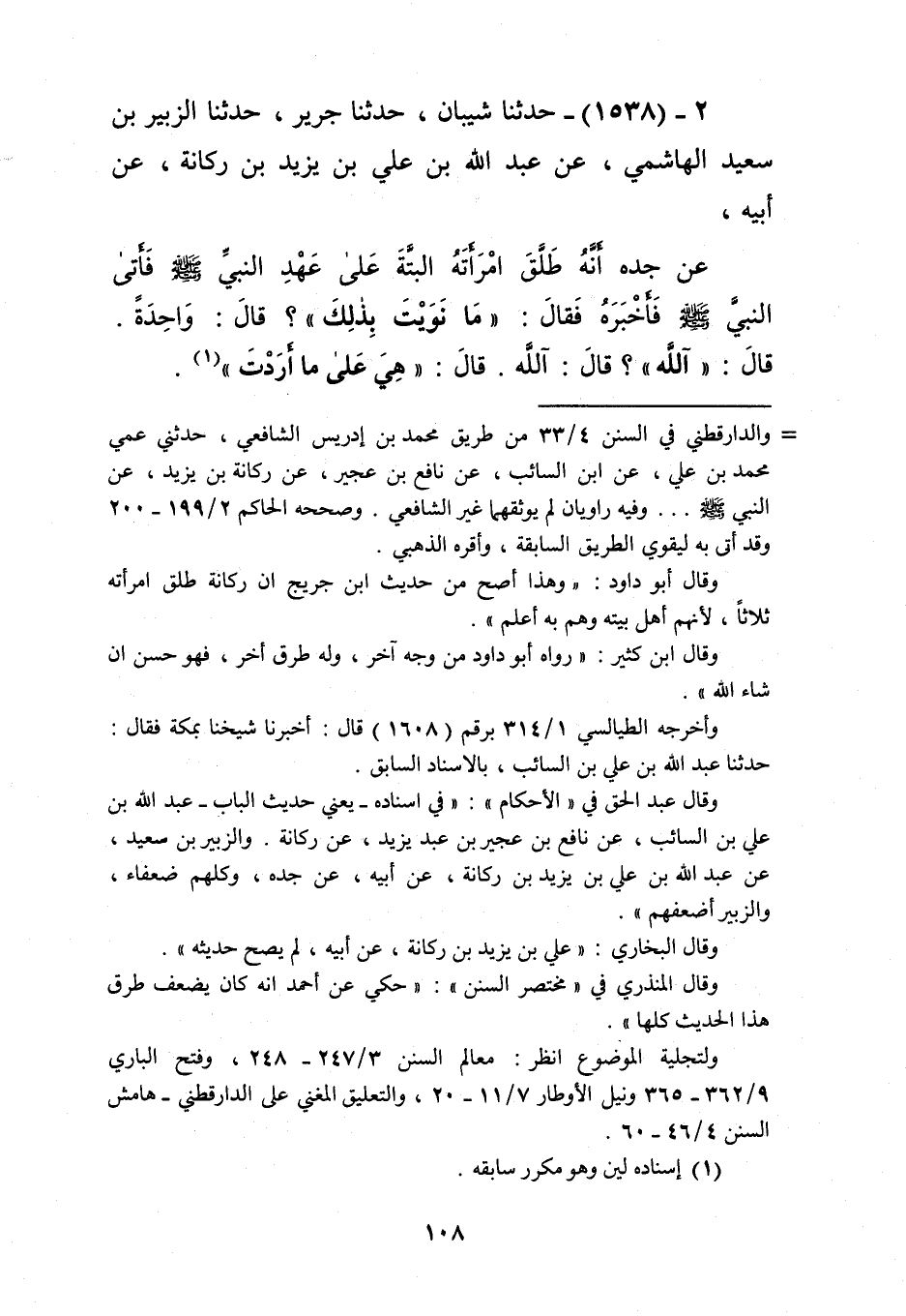 1538 - حَدَّثَنَا شَيْبَانُ، حَدَّثَنَا جَرِيرٌ، حَدَّثَنَا الزُّبَيْرُ بْنُ سَعِيدٍ الْهَاشِمِيُّ، عَنْ عَبْدِ اللَّهِ بْنِ عَلِيِّ بْنِ يَزِيدَ بْنِ رُكَانَةَ، عَنْ أَبِيهِ، عَنْ جَدِّهِ، أَنَّهُ طَلَّقَ امْرَأَتَهُ الْبَتَّةَ عَلَى عَهْدِ النَّبِيِّ صَلَّى اللهُ عَلَيْهِ وَسَلَّمَ، فَأَتَى النَّبِيَّ صَلَّى اللهُ عَلَيْهِ وَسَلَّمَ فَأَخْبَرَهُ، فَقَالَ: «§مَا نَوَيْتَ بِذَلِكَ؟» قَالَ: وَاحِدَةً، قَالَ: «آللَّهِ» قَالَ: آللَّهِ، قَالَ: «هِيَ عَلَى مَا أَرَدْتَ» Kإسناده لين
