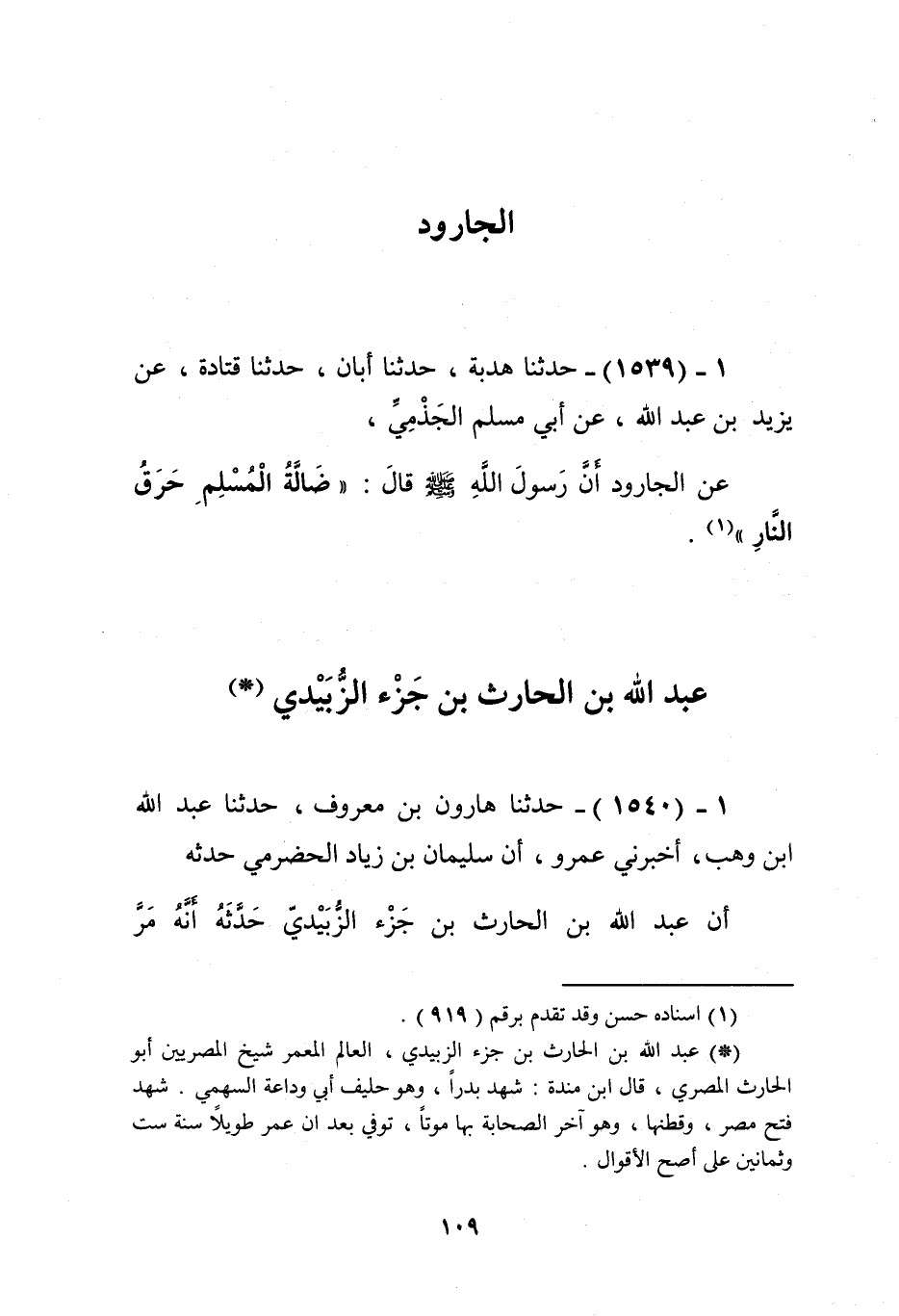 1539 - حَدَّثَنَا هُدْبَةُ، حَدَّثَنَا أَبَانُ، حَدَّثَنَا قَتَادَةُ، عَنْ يَزِيدَ بْنِ عَبْدِ اللَّهِ، عَنْ أَبِي مُسْلِمٍ الْجَذَمِيِّ، عَنِ الْجَارُودِ، أَنَّ رَسُولَ اللَّهِ صَلَّى اللهُ عَلَيْهِ وَسَلَّمَ قَالَ: «§ضَالَّةُ الْمُسْلِمِ حَرَقُ النَّارِ» Kإسناده حسن