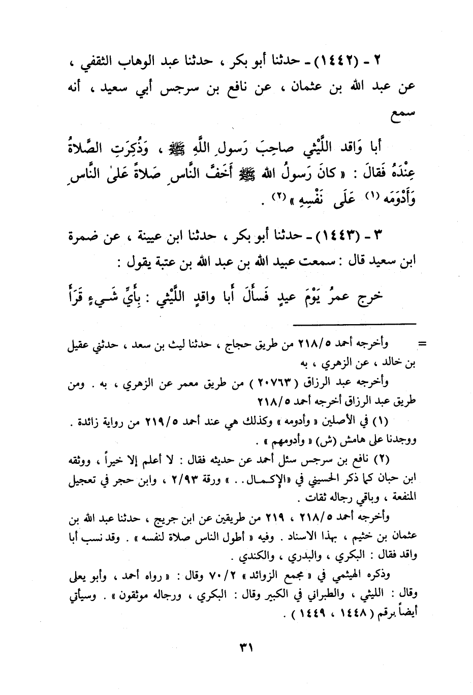 1442 - حَدَّثَنَا أَبُو بَكْرٍ، حَدَّثَنَا عَبْدُ الْوَهَّابِ الثَّقَفِيُّ، عَنْ عَبْدِ اللَّهِ بْنِ عُثْمَانَ، عَنْ نَافِعِ بْنِ سَرْجِسَ أَبِي سَعِيدٍ، أَنَّهُ سَمِعَ أَبَا وَاقِدٍ اللَّيْثِيَّ، صَاحِبَ رَسُولِ اللَّهِ صَلَّى اللهُ عَلَيْهِ وَسَلَّمَ، وَذُكِرَتِ الصَّلَاةُ، عَنْدَهُ، فَقَالَ: «كَانَ رَسُولُ اللَّهِ صَلَّى اللهُ عَلَيْهِ وَسَلَّمَ §أَخَفَّ النَّاسِ صَلَاةً عَلَى النَّاسِ وَأَدْوَمَهُ عَلَى نَفْسِهِ»