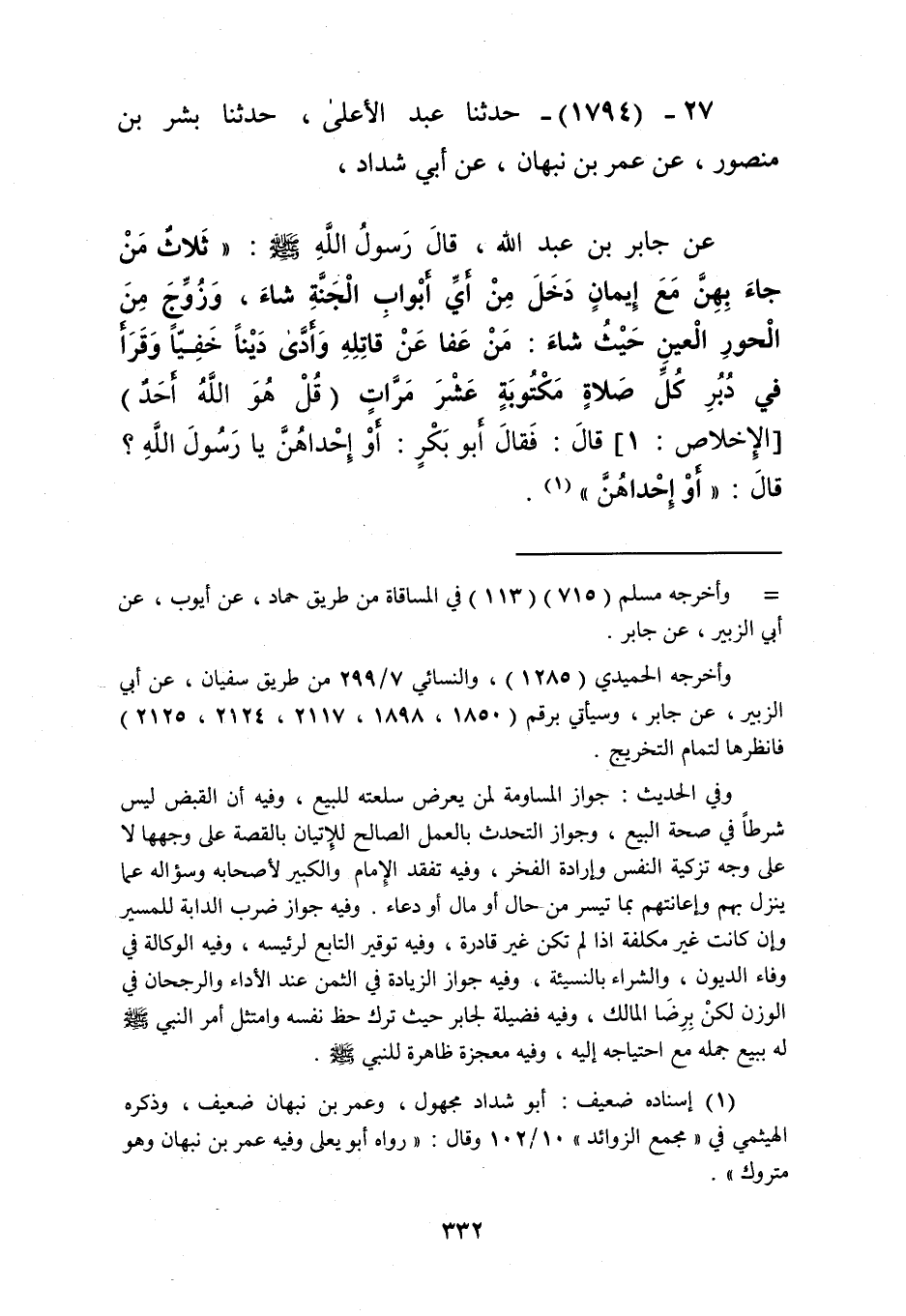1794 - حَدَّثَنَا عَبْدُ الْأَعْلَى، حَدَّثَنَا بِشْرُ بْنُ مَنْصُورٍ، عَنْ عُمَرَ بْنِ نَبْهَانَ، عَنْ أَبِي شَدَّادٍ، عَنْ جَابِرِ بْنِ عَبْدِ اللَّهِ قَالَ: رَسُولُ اللَّهِ صَلَّى اللهُ عَلَيْهِ وَسَلَّمَ: " §ثَلَاثٌ مَنْ جَاءَ بِهِنَّ مَعَ إِيمَانٍ دَخَلَ مِنْ أَيِّ أَبْوَابِ الْجَنَّةِ شَاءَ، وَزُوِّجَ مِنَ الْحُورِ الْعِينِ حَيْثُ شَاءَ: مَنْ عَفَا عَنْ قَاتِلِهِ، وَأَدَّى دَيْنًا خَفِيًّا، وَقَرَأَ فِي دُبُرِ كُلِّ صَلَاةٍ مَكْتُوبَةٍ عَشْرَ مَرَّاتٍ قُلْ هُوَ اللَّهُ أَحَدٌ "، قَالَ: فَقَالَ أَبُو بَكْرٍ: أَوْ إِحْدَاهُنَّ يَا رَسُولَ اللَّهِ، قَالَ: «أَوْ إِحْدَاهُنَّ» Kإسناده ضعيف