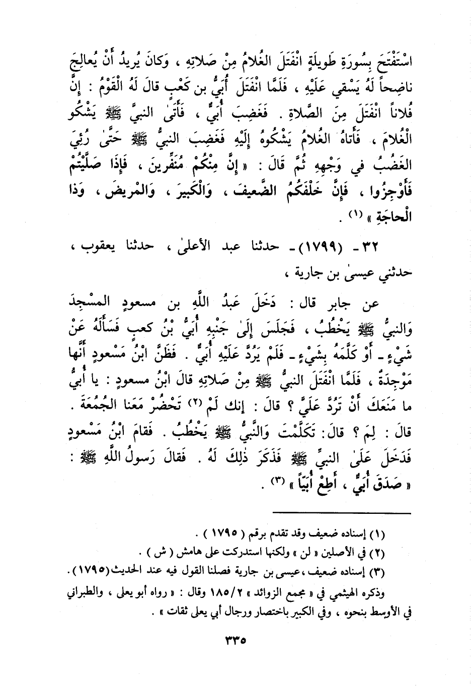 1799 - حَدَّثَنَا عَبْدُ الْأَعْلَى، حَدَّثَنَا يَعْقُوبُ، حَدَّثَنِي عِيسَى بْنُ جَارِيَةَ، عَنْ جَابِرٍ قَالَ: دَخَلَ عَبْدُ اللَّهِ بْنُ مَسْعُودٍ الْمَسْجِدَ وَالنَّبِيُّ صَلَّى اللهُ عَلَيْهِ وَسَلَّمَ يَخْطُبُ، فَجَلَسَ إِلَى جَنْبِهِ أُبَيُّ بْنُ كَعْبٍ فَسَأَلَهُ عَنْ شَيْءٍ أَوْ كَلَّمَهُ بِشَيْءٍ فَلَمْ يَرُدَّ عَلَيْهِ أُبَيٌّ، فَظَنَّ ابْنُ مَسْعُودٍ أَنَّهَا مَوْجِدَةٌ، فَلَمَّا انْفَتَلَ النَّبِيُّ صَلَّى اللهُ عَلَيْهِ وَسَلَّمَ مِنْ صَلَاتِهِ، قَالَ ابْنُ مَسْعُودٍ: يَا أُبَيُّ، مَا مَنَعَكَ أَنْ تَرُدَّ عَلَيَّ؟ قَالَ: §إِنَّكَ لَمْ تَحْضُرْ مَعَنَا الْجُمُعَةَ، قَالَ: لِمَ؟ قَالَ: تَكَلَّمْتَ وَالنَّبِيُّ صَلَّى اللهُ عَلَيْهِ وَسَلَّمَ يَخْطُبُ، فَقَامَ ابْنُ مَسْعُودٍ فَدَخَلَ عَلَى النَّبِيِّ صَلَّى اللهُ عَلَيْهِ وَسَلَّمَ فَذَكَرَ ذَلِكَ لَهُ، فَقَالَ رَسُولُ اللَّهِ صَلَّى اللهُ عَلَيْهِ وَسَلَّمَ: «صَدَقَ أُبَيٌّ أَطِعْ أُبَيًّا» -[336]-،