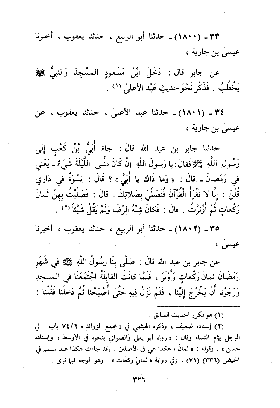 1802 - حَدَّثَنَا أَبُو الرَّبِيعِ، حَدَّثَنَا يَعْقُوبُ، أَخْبَرَنَا عِيسَى، عَنْ جَابِرِ بْنِ عَبْدِ اللَّهِ قَالَ: صَلَّى بِنَا رَسُولُ اللَّهِ صَلَّى اللهُ عَلَيْهِ وَسَلَّمَ فِي شَهْرِ رَمَضَانَ ثَمَانَ رَكَعَاتٍ وَأَوْتَرَ، فَلَمَّا كَانَتِ الْقَابِلَةُ اجْتَمَعْنَا فِي الْمَسْجِدِ وَرَجَوْنَا أَنْ يَخْرُجَ إِلَيْنَا، فَلَمْ نَزَلْ فِيهِ حَتَّى أَصْبَحْنَا، ثُمَّ دَخَلْنَا، فَقُلْنَا: يَا رَسُولَ اللَّهِ، اجْتَمَعْنَا فِي الْمَسْجِدِ وَرَجَوْنَا أَنْ تُصَلِّيَ بِنَا، فَقَالَ: «إِنِّي §خَشِيتُ أَوْ كَرِهْتُ أَنْ تُكْتَبَ عَلَيْكُمْ» Kإسناده ضعيف