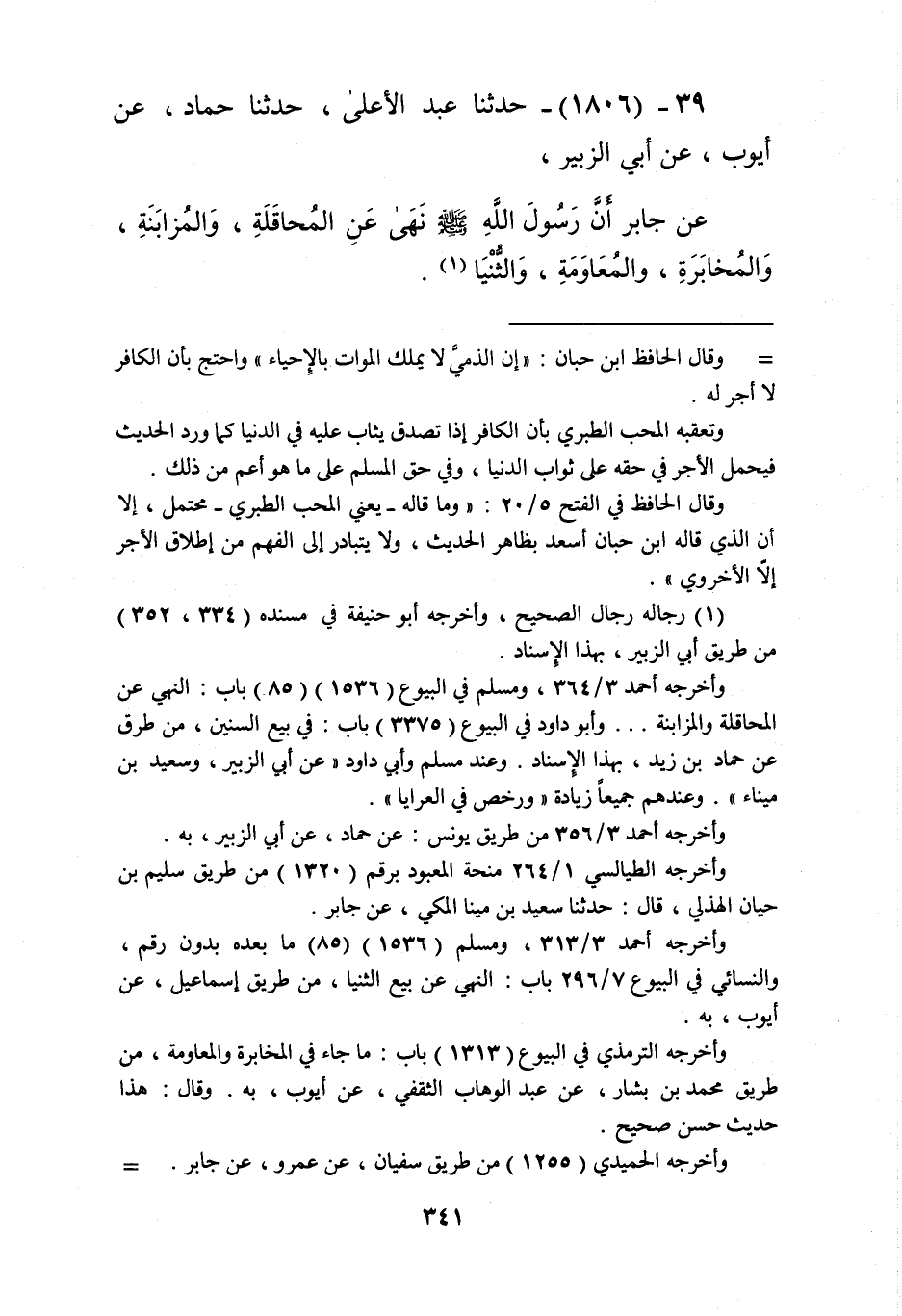 1806 - حَدَّثَنَا عَبْدُ الْأَعْلَى، حَدَّثَنَا حَمَّادٌ، عَنْ أَيُّوبَ، عَنْ أَبِي الزُّبَيْرِ، عَنْ جَابِرٍ، «أَنَّ رَسُولَ اللَّهِ صَلَّى اللهُ عَلَيْهِ وَسَلَّمَ §نَهَى عَنِ الْمُحَاقَلَةِ، وَالْمُزَابَنَةِ، وَالْمُخَابَرَةِ، وَالْمُعَاوَمَةِ، وَالثُّنْيَا» Kرجاله رجال الصحيح