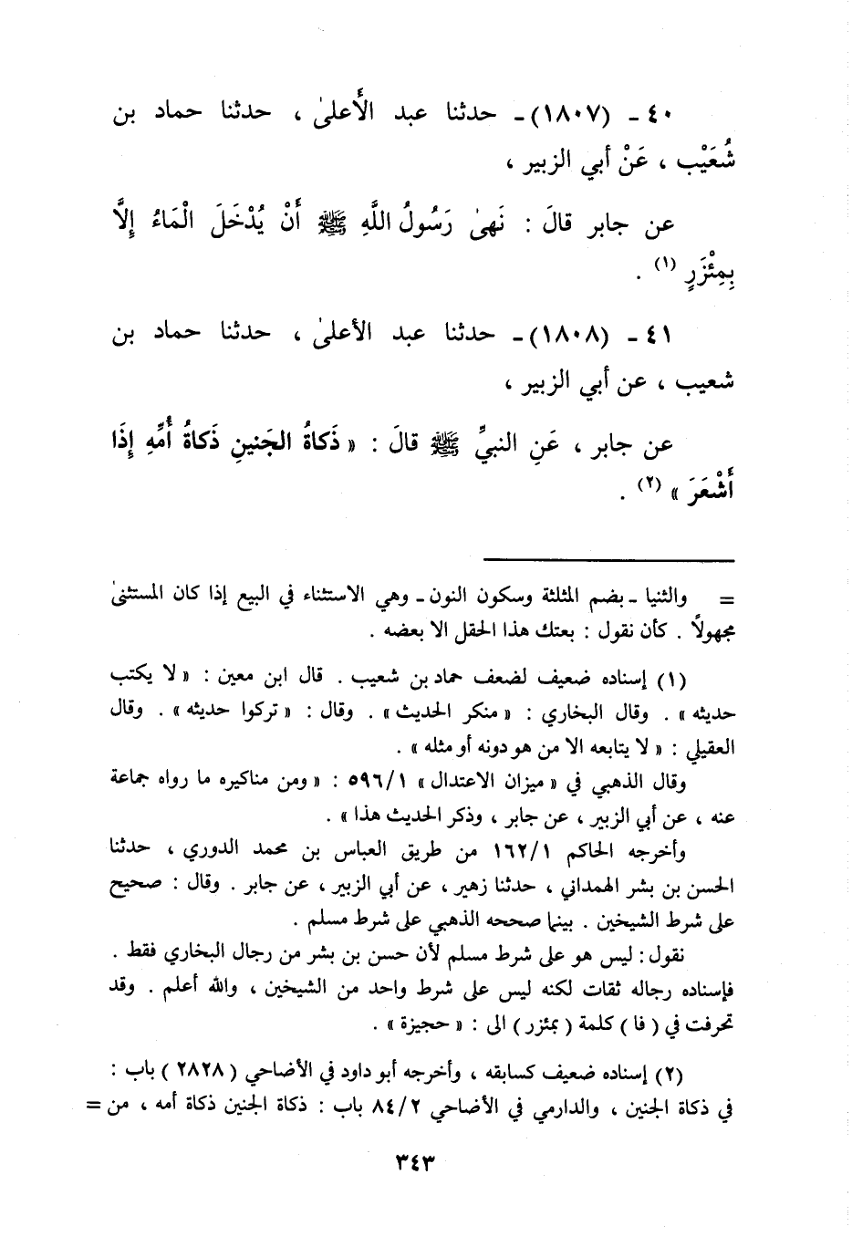 1808 - حَدَّثَنَا عَبْدُ الْأَعْلَى، حَدَّثَنَا حَمَّادُ بْنُ شُعَيْبُ، عَنْ أَبِي الزُّبَيْرِ، عَنْ جَابِرٍ، عَنِ النَّبِيِّ صَلَّى اللهُ عَلَيْهِ وَسَلَّمَ قَالَ: «§ذَكَاةُ الْجَنِينِ ذَكَاةُ أُمِّهِ إِذَا أَشْعَرَ» Kإسناده ضعيف