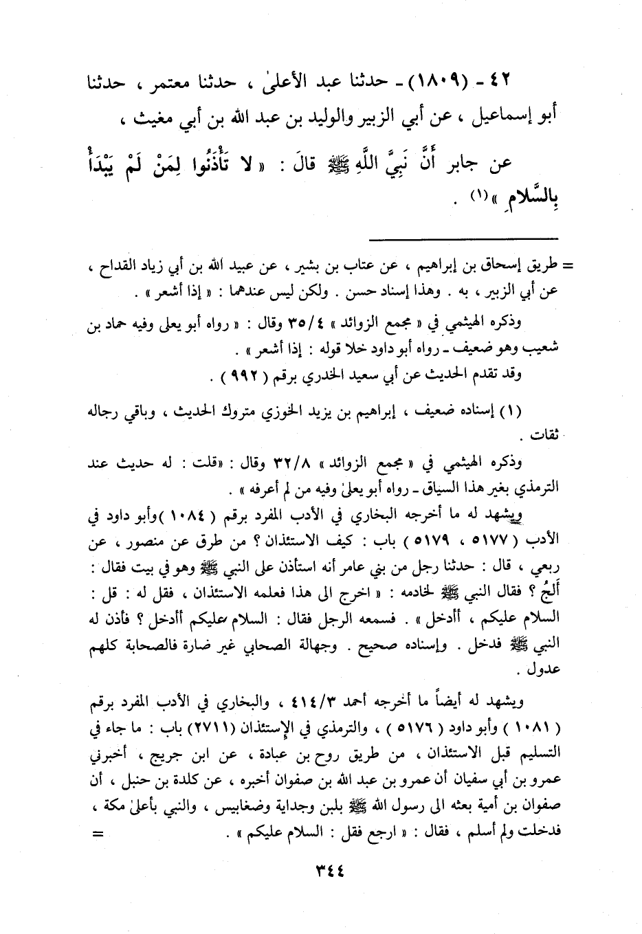 1809 - حَدَّثَنَا عَبْدُ الْأَعْلَى، حَدَّثَنَا مُعْتَمِرٌ، حَدَّثَنَا أَبُو إِسْمَاعِيلَ، عَنْ أَبِي الزُّبَيْرِ، وَالْوَلِيدُ بْنُ عَبْدِ اللَّهِ بْنِ أَبِي مُغِيثٍ، عَنْ جَابِرٍ، أَنَّ نَبِيَّ اللَّهِ صَلَّى اللهُ عَلَيْهِ وَسَلَّمَ قَالَ: «§لَا تَأْذَنُوا لِمَنْ لَمْ يَبْدَأْ بِالسَّلَامِ» Kإسناده ضعيف
