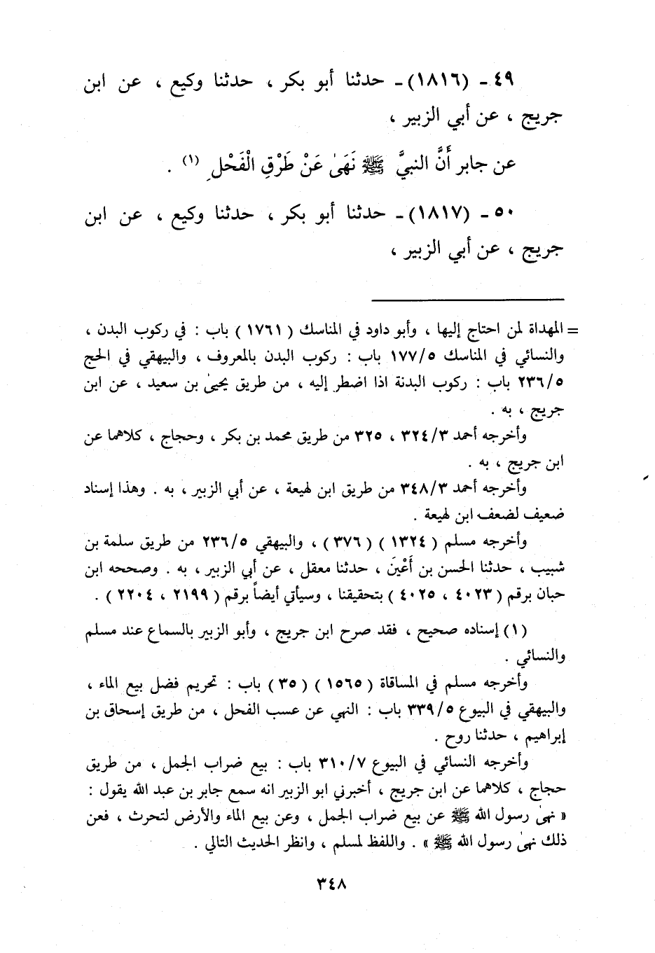 1816 - حَدَّثَنَا أَبُو بَكْرٍ، حَدَّثَنَا وَكِيعٌ، عَنِ ابْنِ جُرَيْجٍ، عَنْ أَبِي الزُّبَيْرِ، عَنْ جَابِرٍ، «أَنَّ النَّبِيَّ صَلَّى اللهُ عَلَيْهِ وَسَلَّمَ §نَهَى عَنْ طَرْقِ الْفَحْلِ» Kإسناده صحيح