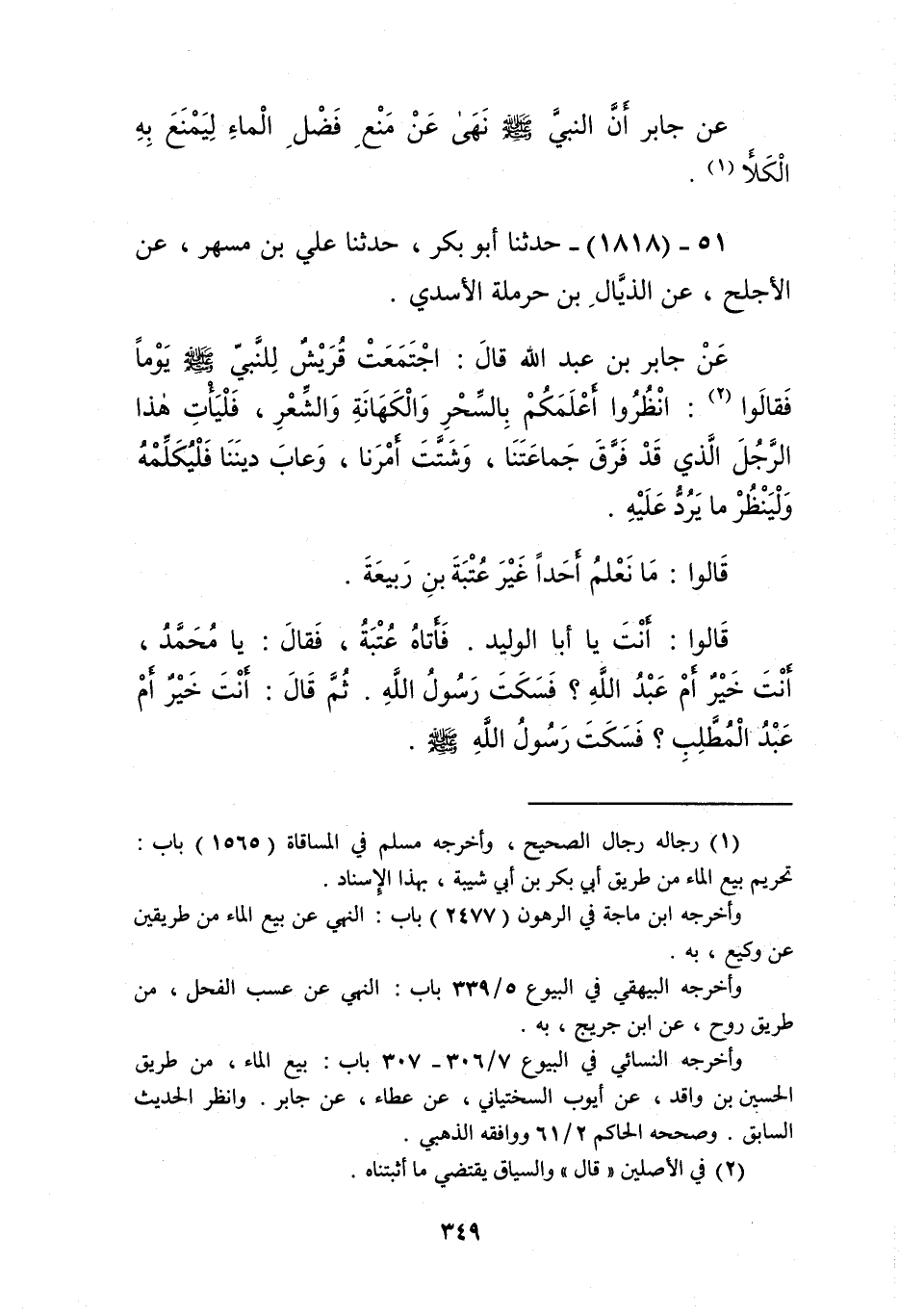 1818 - حَدَّثَنَا أَبُو بَكْرٍ، حَدَّثَنَا عَلِيُّ بْنُ مُسْهِرٍ، عَنِ الْأَجْلَحِ، عَنِ الذَّيَّالِ بْنِ حَرْمَلَةَ الْأَسَدِيِّ، عَنْ جَابِرِ بْنِ عَبْدِ اللَّهِ قَالَ: اجْتَمَعَتْ قُرَيْشٌ لِلنَّبِيِّ صَلَّى اللهُ عَلَيْهِ وَسَلَّمَ يَوْمًا، فَقَالُوا: انْظُرُوا أَعْلَمَكُمْ بِالسِّحْرِ وَالْكَهَانَةِ، وَالشِّعْرِ، فَلْيَأْتِ هَذَا الرَّجُلَ الَّذِي قَدْ فَرَّقَ جَمَاعَتَنَا، وَشَتَّتَ أَمْرَنَا، وَعَابَ دِينَنَا، فَلْيُكَلِّمْهُ وَلْيَنْظُرْ مَا يَرُدُّ عَلَيْهِ، قَالُوا: مَا نَعْلَمُ أَحَدًا غَيْرَ عُتْبَةَ بْنِ رَبِيعَةَ، قَالُوا: أَنْتَ يَا أَبَا الْوَلِيدِ، فَأَتَاهُ عُتْبَةُ، فَقَالَ: يَا مُحَمَّدُ، أَنْتَ خَيْرٌ أَمْ عَبْدُ اللَّهِ، فَسَكَتَ رَسُولُ اللَّهِ، ثُمَّ قَالَ: أَنْتَ خَيْرٌ أَمْ عَبْدُ الْمُطَّلِبِ، فَسَكَتَ رَسُولُ اللَّهِ صَلَّى اللهُ عَلَيْهِ وَسَلَّمَ -[350]-، قَالَ: فَإِنْ كُنْتَ تَزْعُمُ أَنَّ هَؤُلَاءِ خَيْرٌ مِنْكَ فَقَدْ عَبَدُوا الْآلِهَةَ الَّتِي عِبْتَ، وَإِنْ كُنْتَ تَزْعُمُ أَنَّكَ خَيْرٌ مِنْهُمْ فَتَكَلَّمْ حَتَّى نَسْمَعَ قَوْلَكَ، إِنَّا وَاللَّهِ مَا رَأَيْنَا سَخْلَةً قَطُّ أَشْأَمَ عَلَى قَوْمِكَ مِنْكَ، فَرَّقْتَ جَمَاعَتَنَا، وَشَتَّتَ أَمْرَنَا، وَعِبْتَ دِينَنَا، فَفَضَحْتَنَا فِي الْعَرَبِ، حَتَّى لَقَدْ طَارَ فِيهِمْ أَنَّ فِي قُرَيْشٍ سَاحِرًا، وَأَنَّ فِي قُرَيْشٍ كَاهِنًا، وَاللَّهِ مَا نَنْتَظِرُ إِلَّا مِثْلَ صَيْحَةَ الْحُبْلَى بِأَنْ يَقُومَ بَعْضُنَا إِلَى بَعْضٍ بِالسُّيُوفِ حَتَّى نَتَفَانَى أَيُّهَا الرَّجُلُ، إِنْ كَانَ إِنَّمَا بِكَ الْحَاجَةُ جَمَعْنَا حَتَّى تَكُونَ أَغْنَى قُرَيْشٍ رَجُلًا، وَإِنْ كَانَ إِنَّمَا بِكَ الْبَاءَةُ فَاخْتَرْ أَيَّ نِسَاءِ قُرَيْشٍ شِئْتَ فَنُزَوِّجُكَ عَشْرًا، قَالَ لَهُ رَسُولُ اللَّهِ: «أَفَرَغْتَ»، قَالَ: نَعَمْ، قَالَ: فَقَالَ رَسُولُ اللَّهِ صَلَّى اللهُ عَلَيْهِ وَسَلَّمَ: " §بِسْمِ اللَّهِ الرَّحْمَنِ الرَّحِيمِ {حم تَنْزِيلٌ مِنَ الرَّحْمَنِ الرَّحِيمِ} [فصلت: 2]، حَتَّى بَلَغَ {فَإِنْ أَعْرَضُوا فَقُلْ أَنْذَرْتُكُمْ صَاعِقَةً مِثْلَ صَاعِقَةِ عَادٍ وَثَمُودَ} [فصلت: 13] "، فَقَالَ عُتْبَةُ: حَسْبُكَ حَسْبُكَ، مَا عِنْدَكَ غَيْرُ هَذَا؟ قَالَ: «لَا»، فَرَجَعَ إِلَى قُرَيْشٍ، فَقَالُوا: مَا وَرَاءَكَ؟ قَالَ: مَا تَرَكْتُ شَيْئًا أَرَى أَنَّكُمْ تُكَلِّمُونَهُ بِهِ إِلَّا كَلَّمْتُهُ، قَالُوا: هَلْ أَجَابَكَ؟ قَالَ: نَعَمْ، وَالَّذِي نَصَبَهَا بَنِيَّةً، مَا فَهِمْتُ شَيْئًا مِمَّا قَالَ غَيْرَ أَنَّهُ قَالَ: {أَنْذَرْتُكُمْ صَاعِقَةً مِثْلَ صَاعِقَةِ عَادٍ وَثَمُودَ} [فصلت: 13]