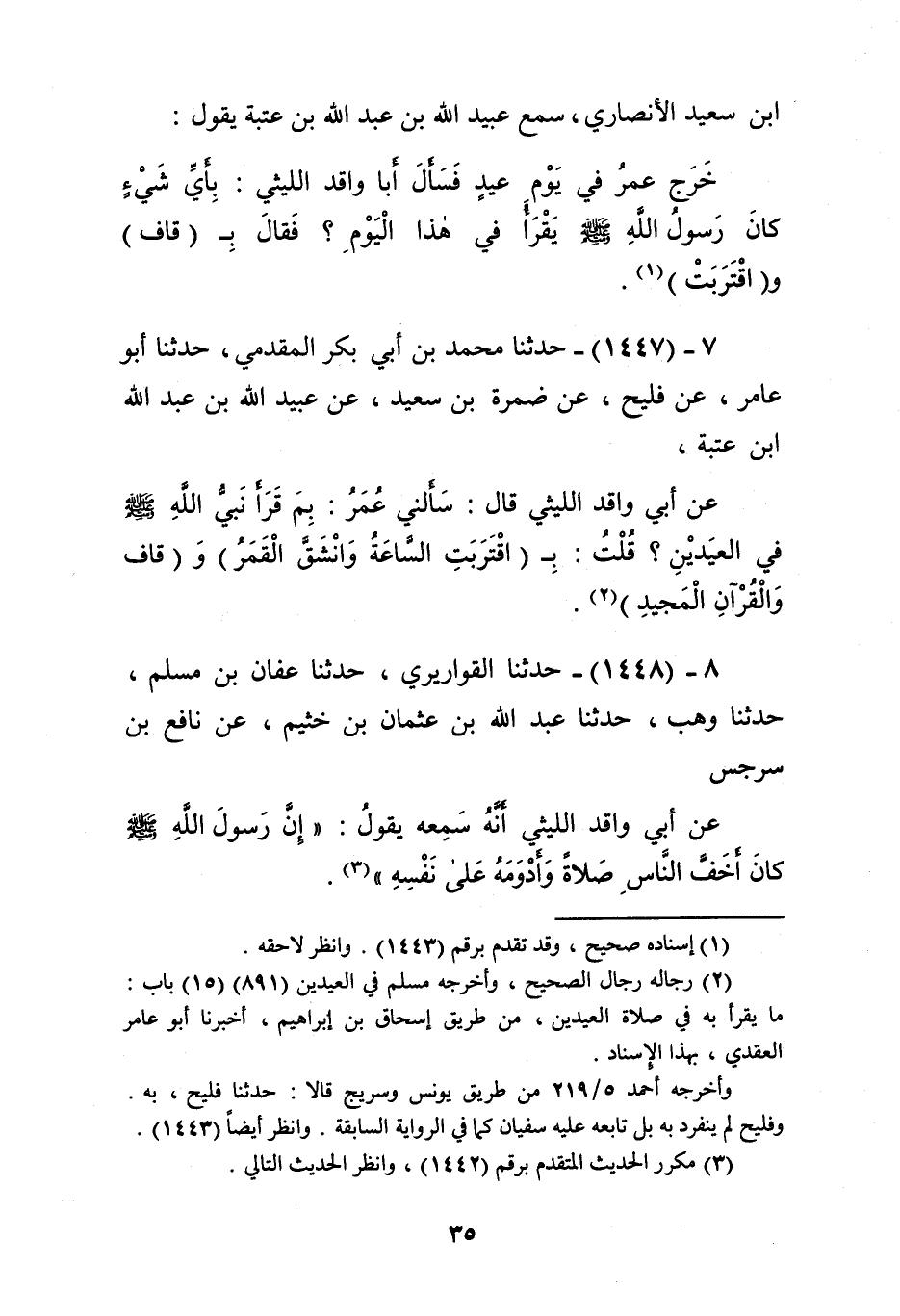 1447 - حَدَّثَنَا مُحَمَّدُ بْنُ أَبِي بَكْرٍ الْمُقَدَّمِيُّ، حَدَّثَنَا أَبُو عَامِرٍ، عَنْ فُلَيْحٍ، عَنْ ضَمْرَةَ بْنِ سَعِيدٍ، عَنْ عُبَيْدِ اللَّهِ بْنِ عَبْدِ اللَّهِ بْنِ عُتْبَةَ، عَنْ أَبِي وَاقِدٍ اللَّيْثِيِّ، قَالَ: سَأَلَنِي عُمَرُ: §بِمَ قَرَأَ نَبِيُّ اللَّهِ صَلَّى اللهُ عَلَيْهِ وَسَلَّمَ فِي الْعِيدَيْنِ؟ قُلْتُ: «بِاقْتَرَبَتِ السَّاعَةُ وَانْشَقَّ الْقَمَرُ، وَقَافْ وَالْقُرْآنِ الْمَجِيدِ» Kرجاله رجال الصحيح