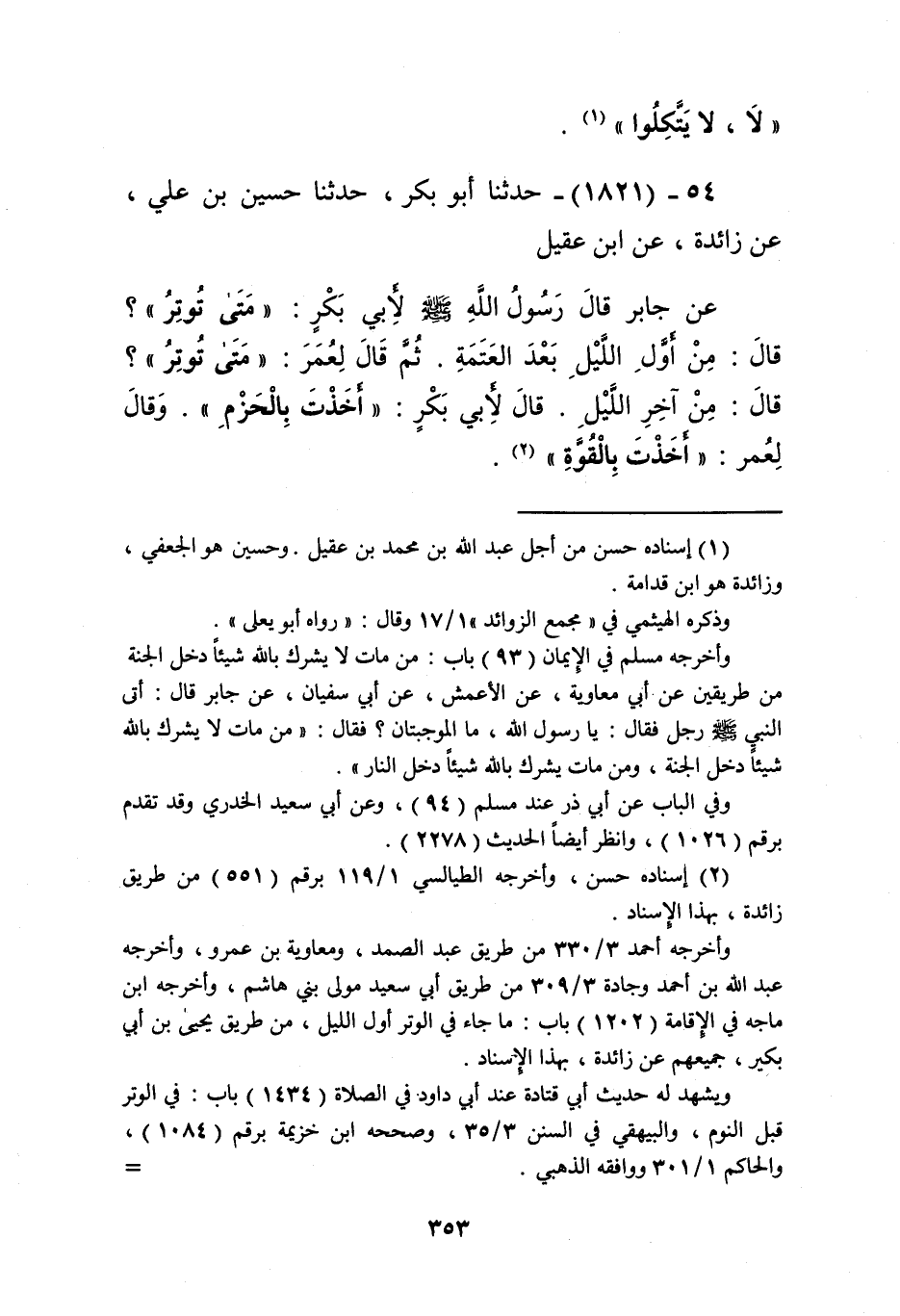 1821 - حَدَّثَنَا أَبُو بَكْرٍ، حَدَّثَنَا حُسَيْنُ بْنُ عَلِيٍّ، عَنْ زَائِدَةَ، عَنِ ابْنِ عُقَيْلٍ، عَنْ جَابِرٍ، قَالَ رَسُولُ اللَّهِ صَلَّى اللهُ عَلَيْهِ وَسَلَّمَ لِأَبِي بَكْرٍ: «§مَتَى تُوتِرُ؟»، قَالَ: مِنْ أَوَّلِ اللَّيْلِ بَعْدَ الْعَتَمَةِ، ثُمَّ قَالَ لِعُمَرَ: «مَتَى تُوتِرُ؟»، قَالَ: مِنْ آخِرِ اللَّيْلِ، قَالَ لِأَبِي بَكْرٍ: «أَخَذْتَ بِالْحَزْمِ»، وَقَالَ لِعُمَرَ: «أَخَذْتَ بِالْقُوَّةِ» Kإسناده حسن