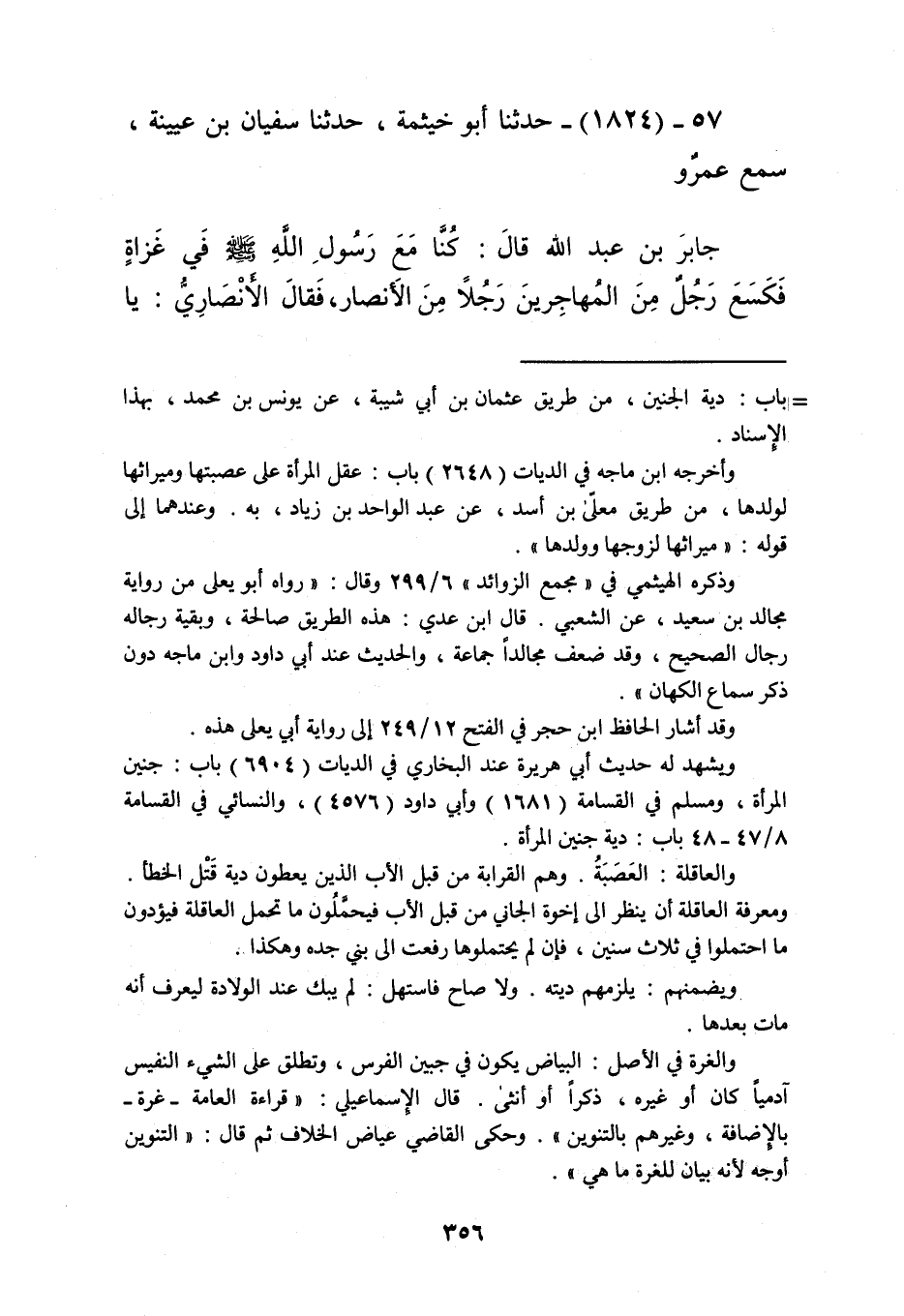 1824 - حَدَّثَنَا أَبُو خَيْثَمَةَ، حَدَّثَنَا سُفْيَانُ بْنُ عُيَيْنَةَ، سَمِعَ عَمْرٌو، جَابِرَ بْنَ عَبْدِ اللَّهِ قَالَ: كُنَّا مَعَ رَسُولِ اللَّهِ صَلَّى اللهُ عَلَيْهِ وَسَلَّمَ فِي غَزَاةٍ، فَكَسَعَ رَجُلٌ مِنَ الْمُهَاجِرِينَ رَجُلًا مِنَ الْأَنْصَارِ، فَقَالَ الْأَنْصَارِيُّ: يَا لِلْأَنْصَارِ، فَقَالَ الْمُهَاجِرِيُّ: يَا لِلْمُهَاجِرِينَ، فَسَمِعَ ذَلِكَ رَسُولُ اللَّهِ صَلَّى اللهُ عَلَيْهِ وَسَلَّمَ، فَقَالَ: «§مَا بَالُ دَعْوَى الْجَاهِلِيَّةِ؟»، قِيلَ: يَا رَسُولَ اللَّهِ، كَسَعَ رَجُلٌ مِنَ الْمُهَاجِرِينَ رَجُلًا مِنَ الْأَنْصَارِ، فَقَالَ رَسُولُ اللَّهِ صَلَّى اللهُ عَلَيْهِ وَسَلَّمَ: «دَعُوهَا فَإِنَّهَا مُنْتِنَةٌ» Kإسناده صحيح