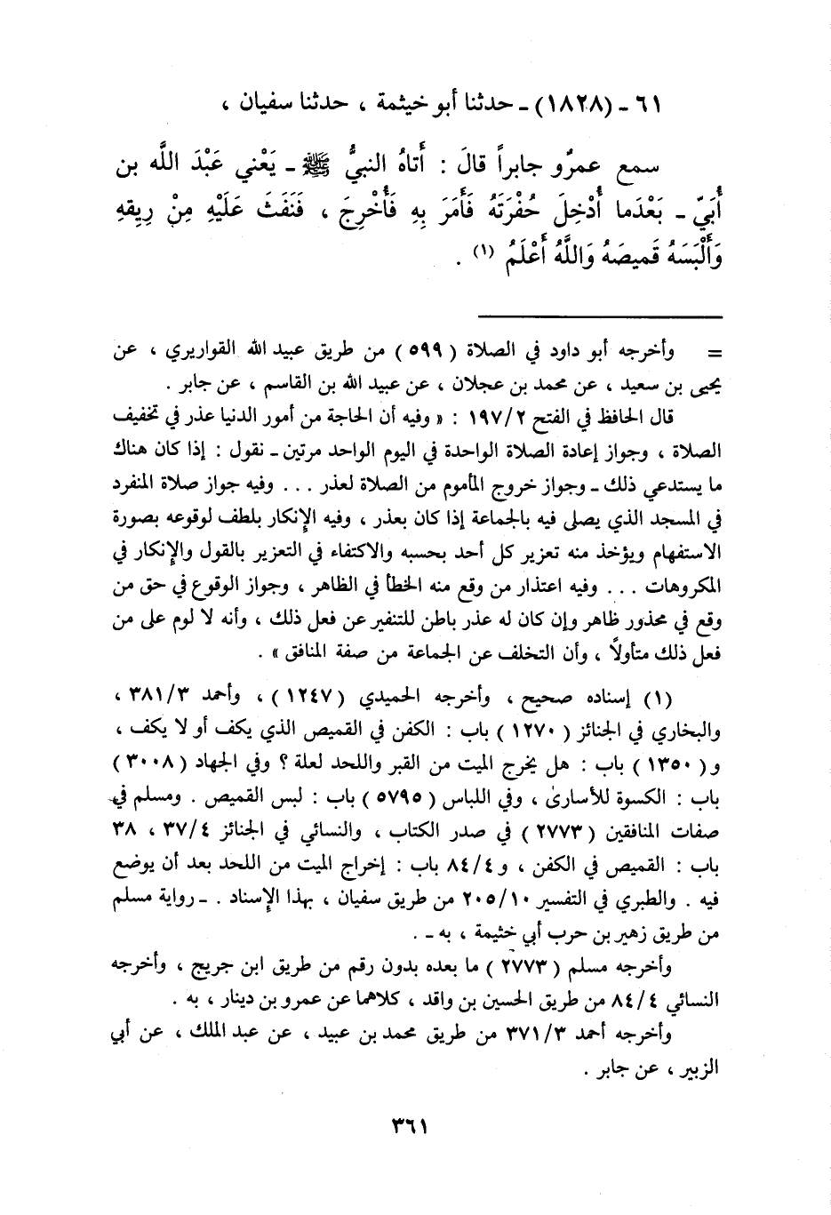 1828 - حَدَّثَنَا أَبُو خَيْثَمَةَ، حَدَّثَنَا سُفْيَانُ، سَمِعَ عَمْرٌو، جَابِرًا قَالَ: «أَتَاهُ النَّبِيُّ صَلَّى اللهُ عَلَيْهِ وَسَلَّمَ ـ يَعْنِي عَبْدَ اللَّهِ بْنَ أُبَيٍّ ـ بَعْدَمَا أُدْخِلَ حُفْرَتَهُ §فَأَمَرَ بِهِ فَأُخْرِجَ، فَنَفَثَ عَلَيْهِ مِنْ رِيقِهِ وَأَلْبَسَهُ قَمِيصَهُ»، وَاللَّهُ أَعْلَمُKإسناده صحيح