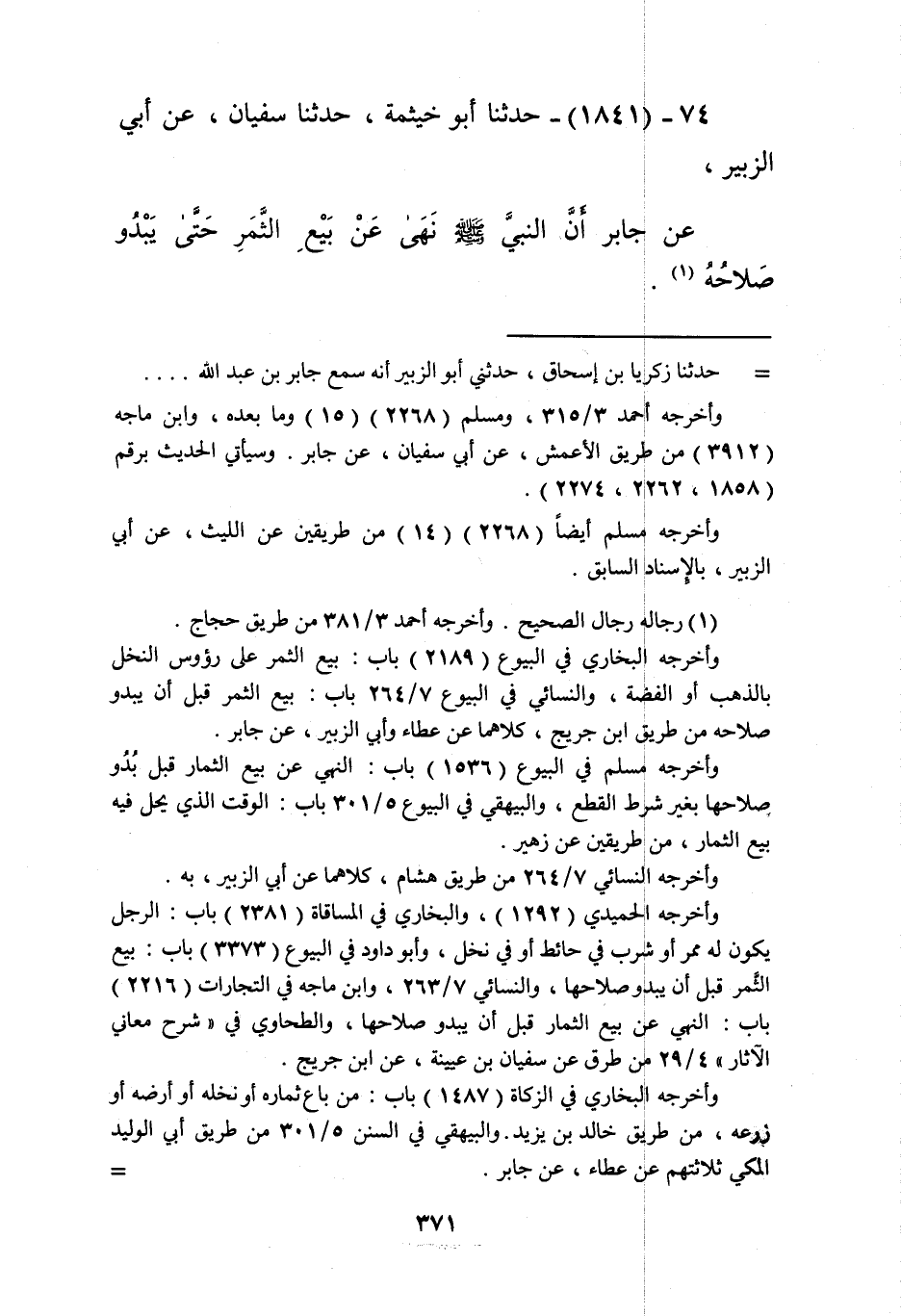 1841 - حَدَّثَنَا أَبُو خَيْثَمَةَ، حَدَّثَنَا سُفْيَانُ، عَنْ أَبِي الزُّبَيْرِ، عَنْ جَابِرٍ، «أَنَّ النَّبِيَّ صَلَّى اللهُ عَلَيْهِ وَسَلَّمَ §نَهَى عَنْ بَيْعِ الثَّمَرِ حَتَّى يَبْدُوَ صَلَاحُهُ» Kرجاله رجال الصحيح