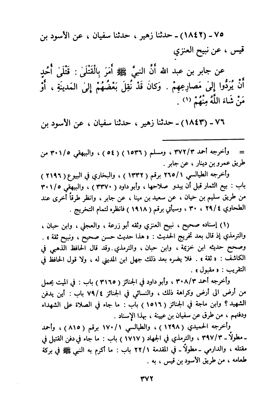 1842 - حَدَّثَنَا زُهَيْرٌ، حَدَّثَنَا سُفْيَانُ، عَنِ الْأَسْوَدِ بْنِ -[373]- قَيْسٍ، عَنْ نُبَيْحٍ الْعَنَزِيِّ، عَنْ جَابِرِ بْنِ عَبْدِ اللَّهِ، «أَنَّ النَّبِيَّ صَلَّى اللهُ عَلَيْهِ وَسَلَّمَ §أَمَرَ بِالْقَتْلَى، قَتْلَى أُحُدٍ أَنْ يُرَدُّوا إِلَى مَصَارِعِهِمْ، وَكَانَ قَدْ نُقِلَ بَعْضُهُمْ إِلَى الْمَدِينَةِ، أَوْ مَنْ شَاءَ اللَّهُ مِنْهُمْ» Kإسناده صحيح