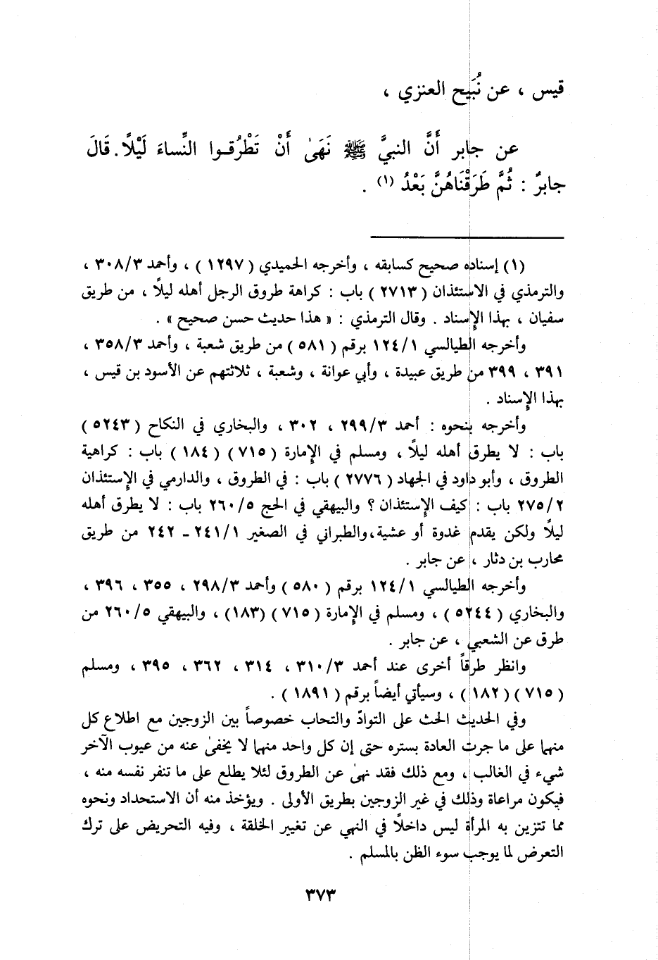 1843 - حَدَّثَنَا زُهَيْرٌ، حَدَّثَنَا سُفْيَانُ، عَنِ الْأَسْوَدِ بْنِ قَيْسٍ، عَنْ نُبَيْحٍ الْعَنَزِيِّ، عَنْ جَابِرٍ، «أَنَّ النَّبِيَّ صَلَّى اللهُ عَلَيْهِ وَسَلَّمَ §نَهَى أَنْ تَطْرُقُوا النِّسَاءَ لَيْلًا»، قَالَ جَابِرٌ: ثُمَّ طَرَقْنَاهُنَّ بَعْدُKإسناده صحيح