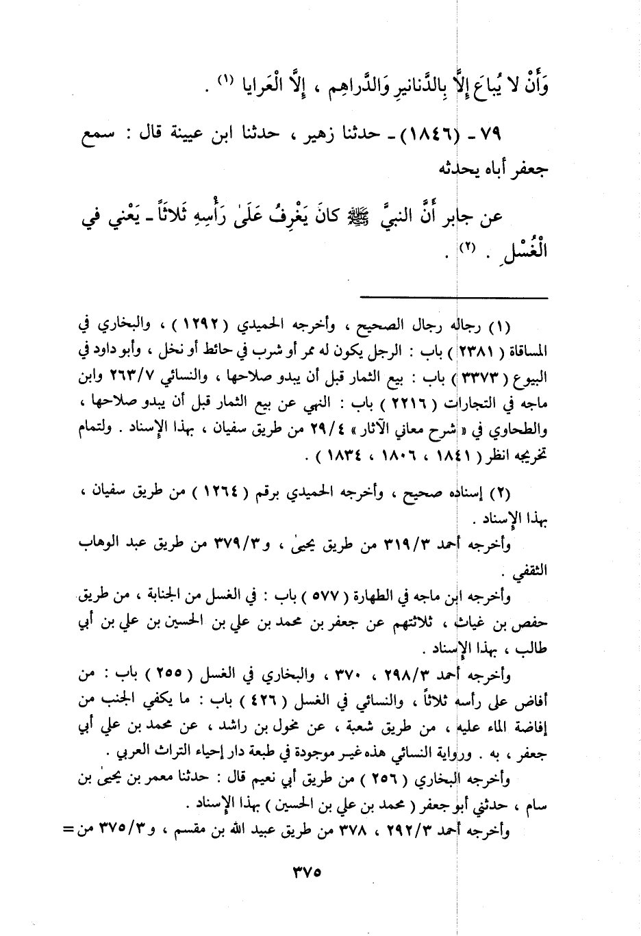 1846 - حَدَّثَنَا زُهَيْرٌ، حَدَّثَنَا ابْنُ عُيَيْنَةَ، قَالَ: سَمِعَ جَعْفَرٌ، أَبَاهُ يُحَدِّثُهُ، عَنْ جَابِرٍ، «أَنَّ النَّبِيَّ صَلَّى اللهُ عَلَيْهِ وَسَلَّمَ كَانَ §يَغْرِفُ عَلَى رَأْسِهِ ثَلَاثًا»، يَعْنِي: فِي الْغُسْلِKإسناده صحيح