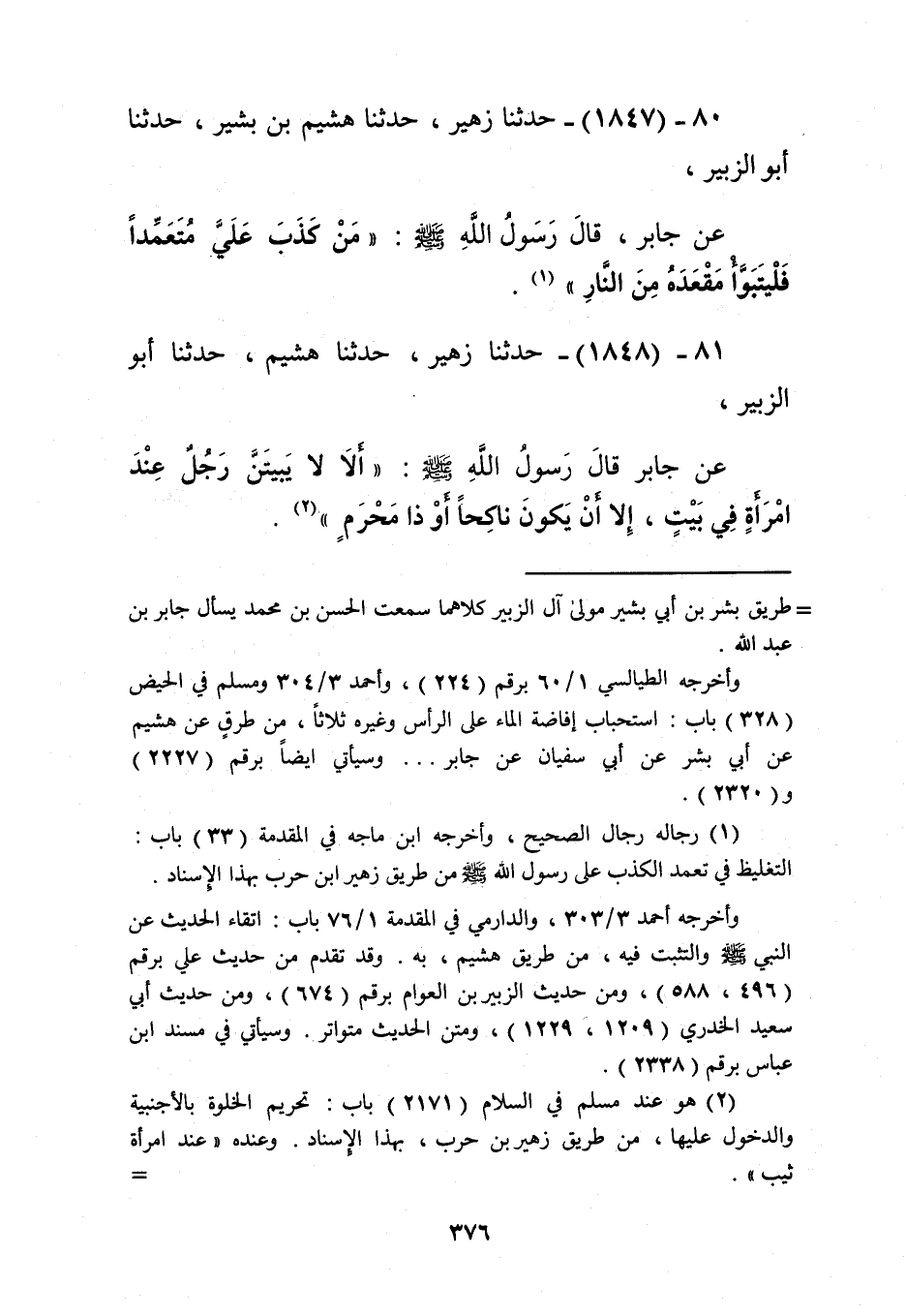 1847 - حَدَّثَنَا زُهَيْرٌ، حَدَّثَنَا هُشَيْمُ بْنُ بَشِيرٍ، حَدَّثَنَا أَبُو الزُّبَيْرِ، عَنْ جَابِرٍ، قَالَ رَسُولُ اللَّهِ صَلَّى اللهُ عَلَيْهِ وَسَلَّمَ: «§مَنْ كَذَبَ عَلَيَّ مُتَعَمِّدًا فَلْيَتَبَوَّأْ مَقْعَدَهُ مِنَ النَّارِ» Kرجاله رجال الصحيح