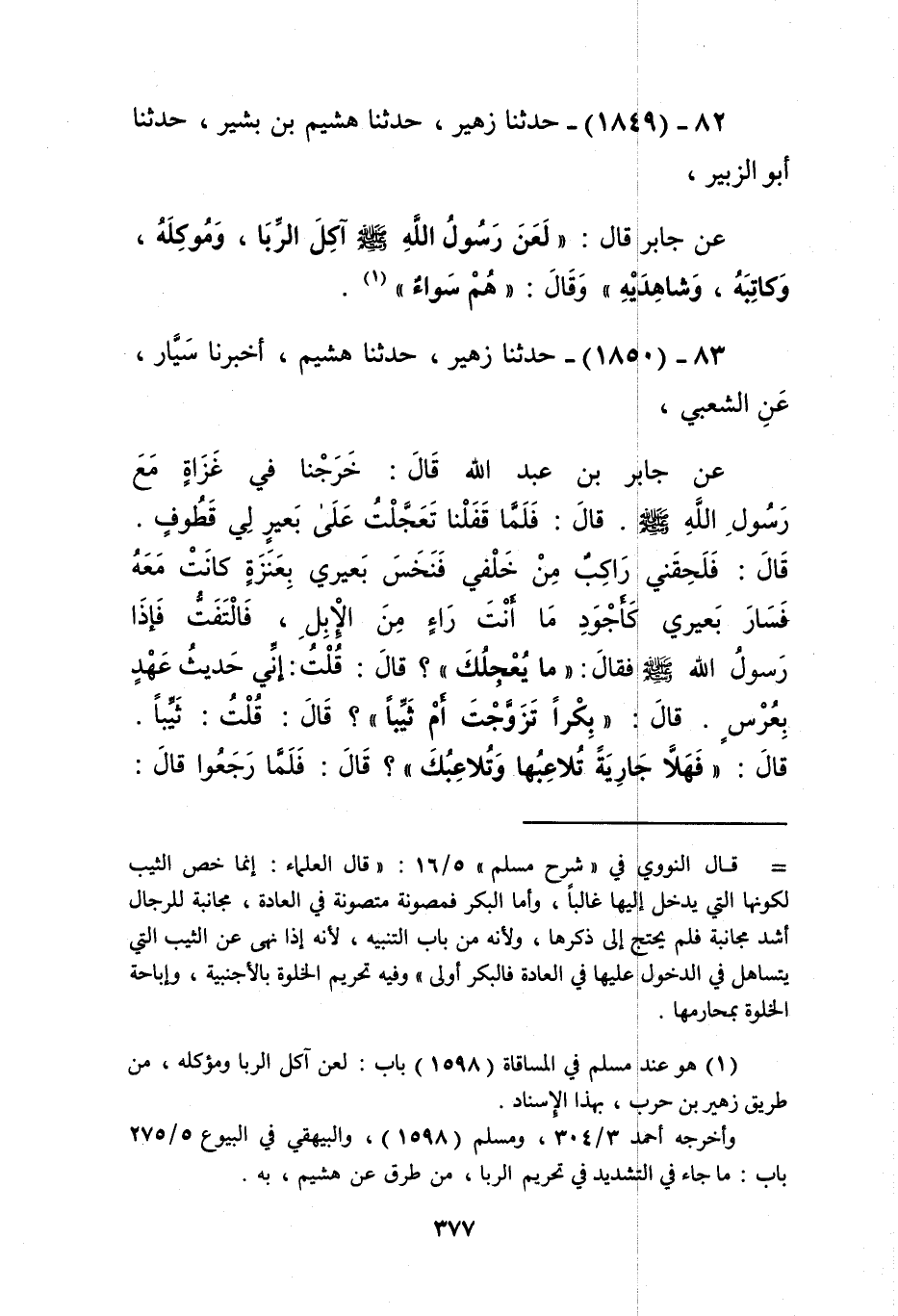 1849 - حَدَّثَنَا زُهَيْرٌ، حَدَّثَنَا هُشَيْمُ بْنُ بَشِيرٍ، حَدَّثَنَا أَبُو الزُّبَيْرِ، عَنْ جَابِرٍ قَالَ: «§لَعَنَ رَسُولُ اللَّهِ صَلَّى اللهُ عَلَيْهِ وَسَلَّمَ آكِلَ الرِّبَا وَمُوكِلَهُ، وَكَاتِبَهُ وَشَاهِدَيْهِ»، وَقَالَ: «هُمْ سَوَاءٌ»
