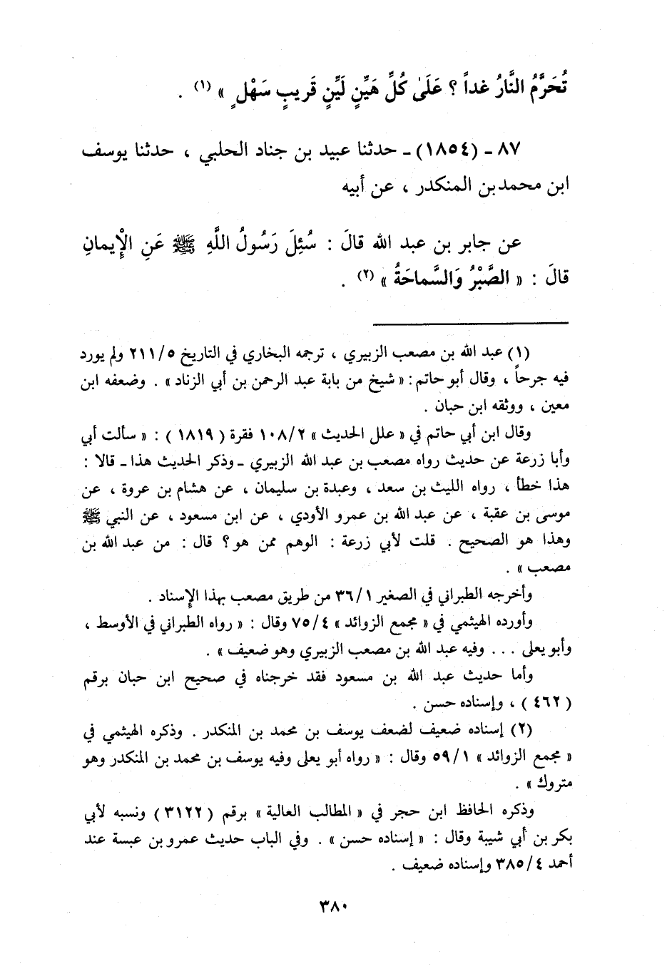 1854 - حَدَّثَنَا عُبَيْدُ بْنُ جُنَادٍ الْحَلَبِيُّ، حَدَّثَنَا يُوسُفُ بْنُ مُحَمَّدِ بْنِ الْمُنْكَدِرِ، عَنْ أَبِيهِ، عَنْ جَابِرِ بْنِ عَبْدِ اللَّهِ قَالَ: سُئِلَ رَسُولُ اللَّهِ صَلَّى اللهُ عَلَيْهِ وَسَلَّمَ، عَنِ الْإِيمَانِ؟ قَالَ: «§الصَّبْرُ وَالسَّمَاحَةُ» Kإسناده ضعيف