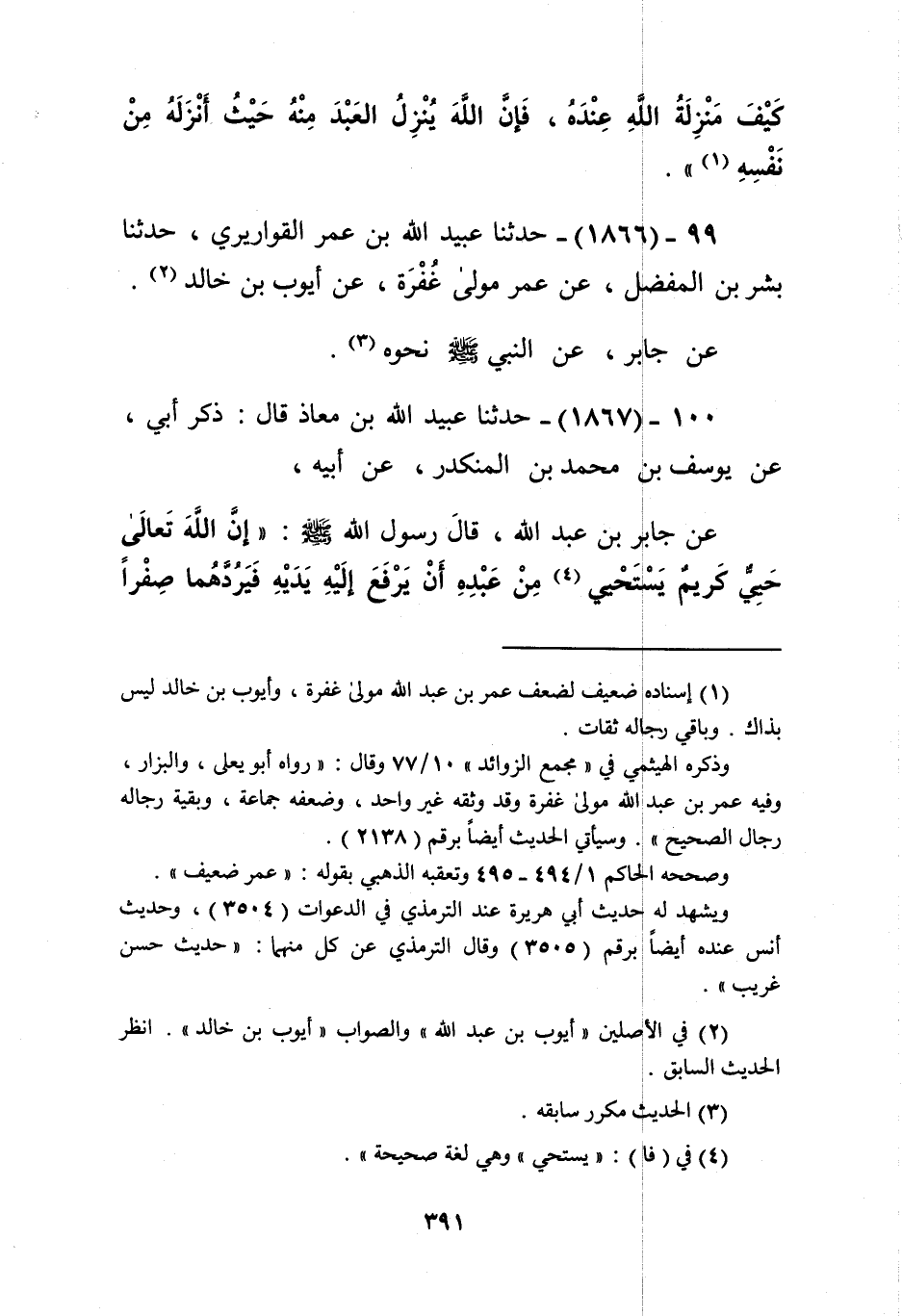 1867 - حَدَّثَنَا عُبَيْدُ اللَّهِ بْنُ مُعَاذٍ، قَالَ: ذَكَرَ أَبِي، عَنْ يُوسُفَ بْنِ مُحَمَّدِ بْنِ الْمُنْكَدِرِ، عَنْ أَبِيهِ، عَنْ جَابِرِ بْنِ عَبْدِ اللَّهِ، قَالَ رَسُولُ اللَّهِ صَلَّى اللهُ عَلَيْهِ وَسَلَّمَ: «إِنَّ §اللَّهَ تَعَالَى حَيِيٌّ كَرِيمٌ يَسْتَحْيِي مِنْ عَبْدِهِ أَنْ يَرْفَعَ إِلَيْهِ يَدَيْهِ فَيَرُدَّهُمَا صِفْرًا لَيْسَ فِيهِمَا شَيْءٌ» Kإسناده ضعيف