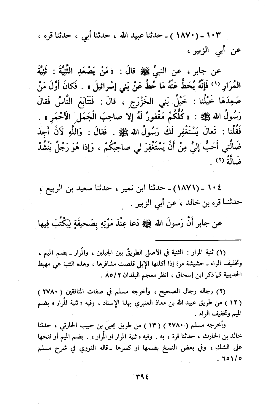 1870 - حَدَّثَنَا عُبَيْدُ اللَّهِ، حَدَّثَنَا أَبِي، حَدَّثَنَا قُرَّةُ، عَنْ أَبِي الزُّبَيْرِ، عَنْ جَابِرٍ، عَنِ النَّبِيِّ صَلَّى اللهُ عَلَيْهِ وَسَلَّمَ قَالَ: «§مَنْ يَصْعَدِ الثَّنِيَّةَ ثَنِيَّةَ الْمُرَارِ فَإِنَّهُ يُحَطُّ عَنْهُ مَا حُطَّ عَنْ بَنِي إِسْرَائِيلَ»، فَكَانَ أَوَّلَ مَنْ صَعِدَهَا خَيْلُنَا خَيْلُ بَنِي الْخَزْرَجِ، قَالَ: فَتَتَابَعَ النَّاسُ، فَقَالَ رَسُولُ اللَّهِ صَلَّى اللهُ عَلَيْهِ وَسَلَّمَ: «كُلُّكُمْ مَغْفُورٌ لَهُ إِلَّا صَاحِبَ الْجَمَلِ الْأَحْمَرِ»، فَقُلْنَا: تَعَالَ يَسْتَغْفِرُ لَكَ رَسُولُ اللَّهِ صَلَّى اللهُ عَلَيْهِ وَسَلَّمَ، فَقَالَ: وَاللَّهِ لَأَنْ أَجِدَ ضَالَّتِي أَحَبُّ إِلَيَّ مِنْ أَنْ يَسْتَغْفِرَ لِي صَاحِبِكُمْ، وَإِذَا هُوَ رَجُلٌ يَنْشُدُ ضَالَّةًKرجاله رجال الصحيح