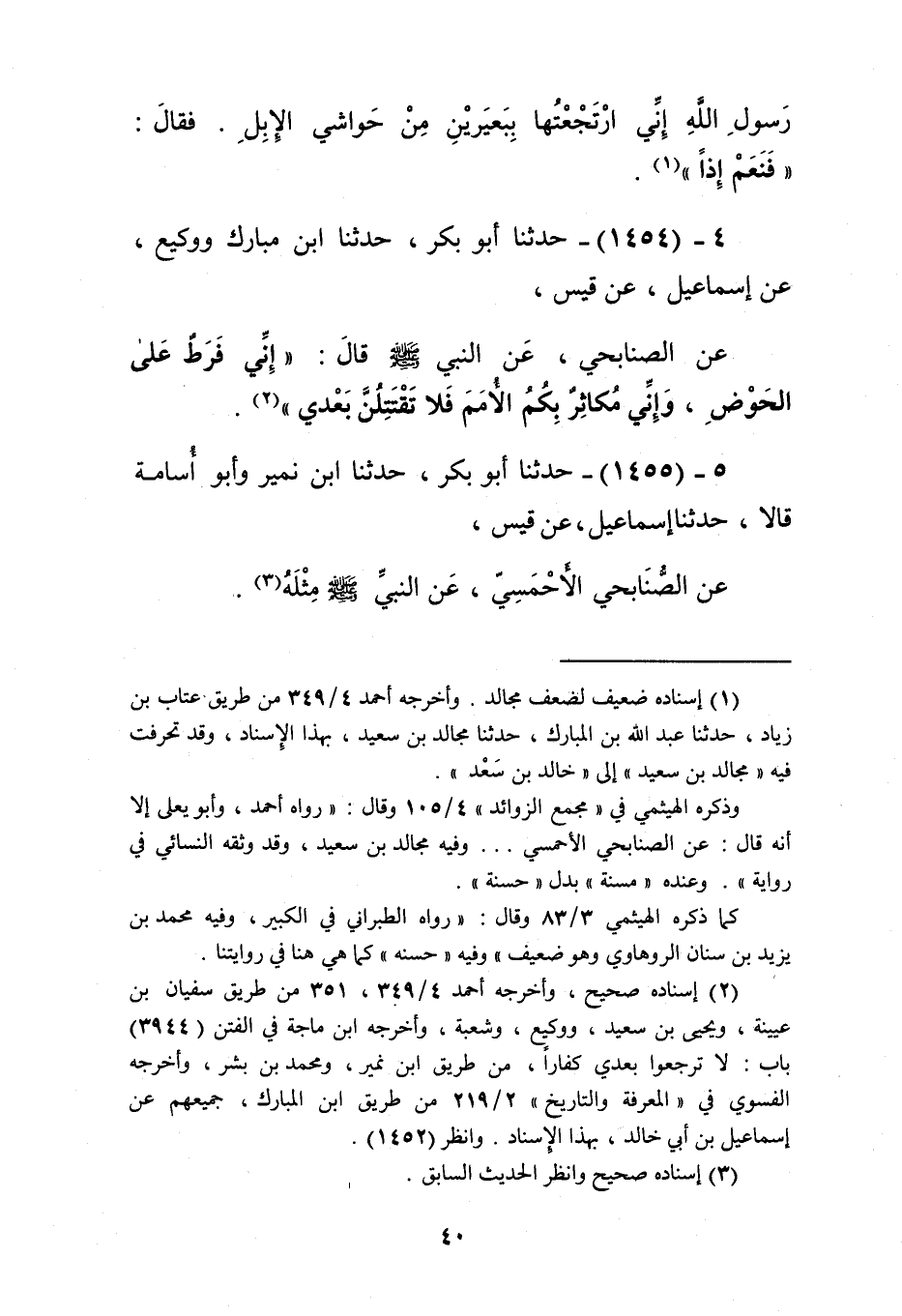 1454 - حَدَّثَنَا أَبُو بَكْرٍ، حَدَّثَنَا ابْنُ مُبَارَكٍ، وَوَكِيعٌ، عَنْ إِسْمَاعِيلَ، عَنْ قَيْسٍ، عَنِ الصُّنَابِحِيّ، عَنِ النَّبِيِّ صَلَّى اللهُ عَلَيْهِ وَسَلَّمَ قَالَ: «§إِنِّي فَرَطٌ عَلَى الْحَوْضِ، وَإِنِّي مُكَاثِرٌ بِكُمُ الْأُمَمَ فَلَا تَقْتَتِلُنَّ بَعْدِي» Kإسناده صحيح