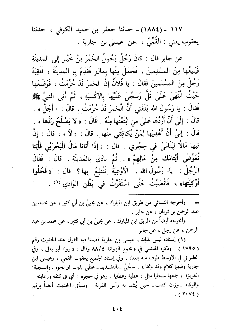 1884 - حَدَّثَنَا جَعْفَرُ بْنُ حُمَيْدٍ الْكُوفِيُّ، حَدَّثَنَا يَعْقُوبُ يَعْنِي الْقُمِّيَّ، عَنْ عِيسَى بْنِ جَارِيَةَ، عَنْ جَابِرٍ قَالَ: كَانَ رَجُلٌ يَحْمِلُ الْخَمْرَ مِنْ خَيْبَرَ إِلَى الْمَدِينَةِ فَيَبِيعُهَا مِنَ الْمُسْلِمِينَ، فَحَمَلَ مِنْهَا بِمَالٍ، فَقَدِمَ بِهِ الْمَدِينَةَ، فَلَقِيَهُ رَجُلٌ مِنَ الْمُسْلِمِينَ، فَقَالَ: يَا فُلَانُ، إِنَّ الْخَمْرَ قَدْ حُرِّمَتْ، فَوَضَعَهَا حَيْثُ انْتَهَى عَلَى تَلٍّ وَسَجَّى عَلَيْهَا بِالْأَكْسِيَةِ، ثُمَّ أَتَى النَّبِيَّ صَلَّى اللهُ عَلَيْهِ وَسَلَّمَ، فَقَالَ: يَا رَسُولَ اللَّهِ، بَلَغَنِي أَنَّ الْخَمْرَ قَدْ حُرِّمَتْ، قَالَ: «أَجَلْ»، قَالَ: إِلَى أَنْ أَرَدَّهَا عَلَى مَنِ ابْتَعْتُهَا مِنْهُ، قَالَ: «لَا يَصْلُحُ رَدُّهَا»، قَالَ: إِلَى أَنْ أَهْدِيَهَا لِمَنْ يُكَافِئُنِي مِنْهَا، قَالَ: «لَا»، قَالَ: إِنَّ فِيهَا مَالًا لِيَتَامَى فِي حِجْرِي، قَالَ: «§إِذَا أَتَانَا مَالُ الْبَحْرَيْنِ فَأْتِنَا نُعَوِّضُ أَيْتَامَكَ مِنْ مَالِهِمْ»، ثُمَّ نَادَى بِالْمَدِينَةِ، قَالَ: فَقَالَ الرَّجُلُ: يَا رَسُولَ اللَّهِ، الْأَوْعِيَةُ نَنْتَفِعُ بِهَا؟ قَالَ: «فَحُلُّوا أَوْكِيَتَهَا»، فَانْصَبَّتْ حَتَّى اسْتَقَرَّتْ فِي بَطْنِ الْوَادِي -[405]-، Kإسناده ليس بذاك