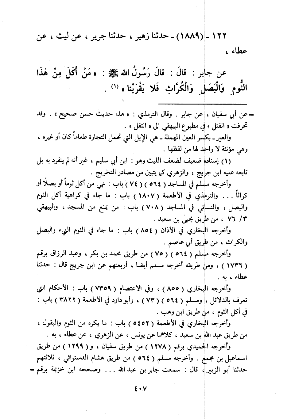 1889 - حَدَّثَنَا زُهَيْرٌ، حَدَّثَنَا جَرِيرٌ، عَنْ لَيْثٍ، عَنْ عَطَاءٍ، عَنْ جَابِرٍ قَالَ: قَالَ رَسُولُ اللَّهِ صَلَّى اللهُ عَلَيْهِ وَسَلَّمَ: «§مَنْ أَكَلَ مِنْ هَذَا الثُّومِ وَالْبَصَلِ وَالْكُرَّاثِ فَلَا يَقْرَبْنَا» Kإسناده ضعيف