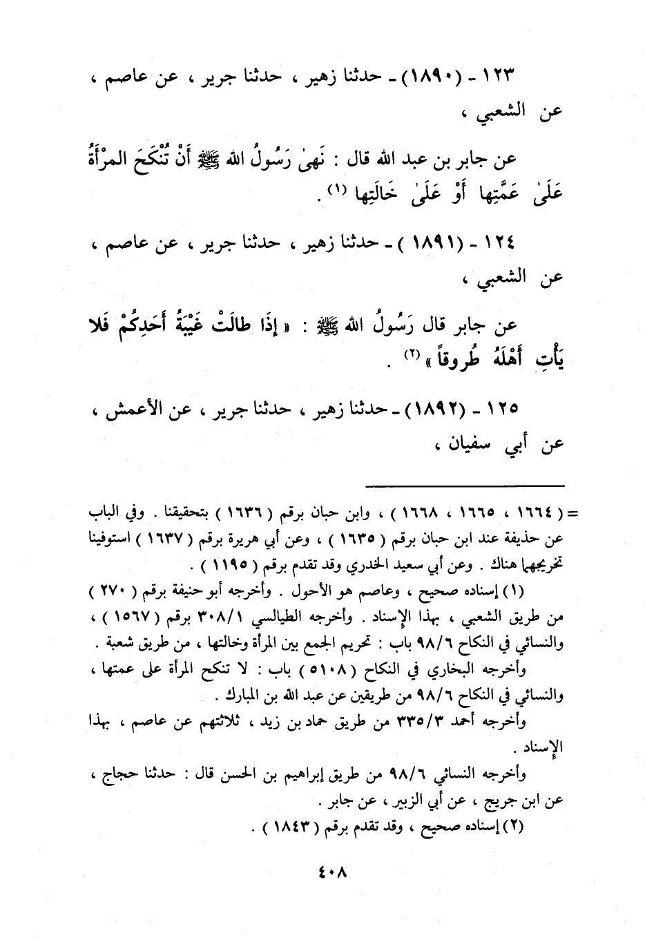1890 - حَدَّثَنَا زُهَيْرٌ، حَدَّثَنَا جَرِيرٌ، عَنْ عَاصِمٍ، عَنِ الشَّعْبِيِّ، عَنْ جَابِرِ بْنِ عَبْدِ اللَّهِ قَالَ: «§نَهَى رَسُولُ اللَّهِ صَلَّى اللهُ عَلَيْهِ وَسَلَّمَ أَنْ تُنْكَحَ الْمَرْأَةُ عَلَى عَمَّتِهَا أَوْ عَلَى خَالَتِهَا» Kإسناده صحيح