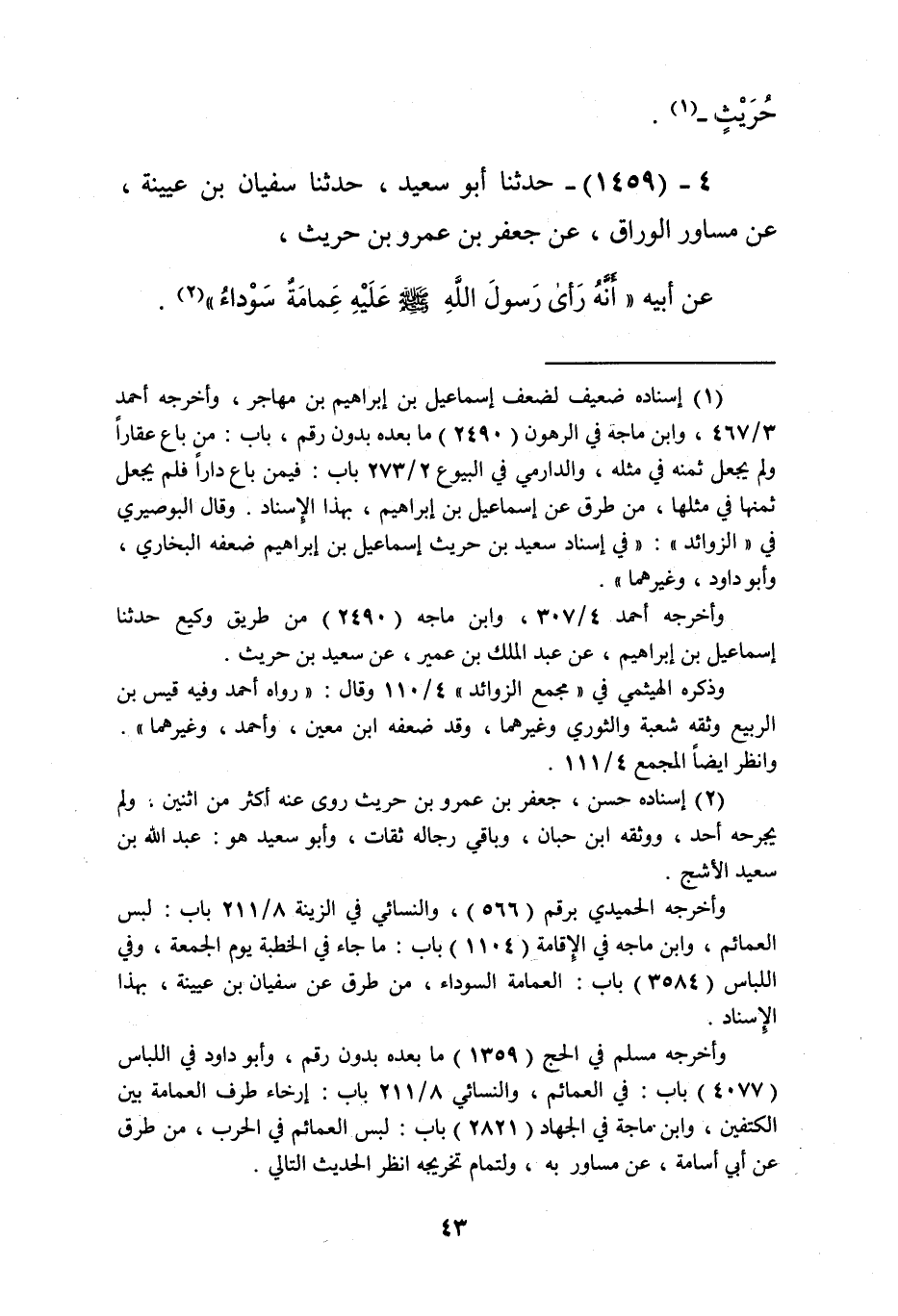 1459 - حَدَّثَنَا أَبُو سَعِيدٍ، حَدَّثَنَا سُفْيَانُ بْنُ عُيَيْنَةَ، عَنْ مُسَاوِرٍ الْوَرَّاقِ، عَنْ جَعْفَرِ بْنِ عَمْرِو بْنِ حُرَيْثٍ، عَنْ أَبِيهِ، «أَنَّهُ رَأَى رَسُولَ اللَّهِ صَلَّى اللهُ عَلَيْهِ وَسَلَّمَ §عَلَيْهِ عِمَامَةٌ سَوْدَاءُ» Kإسناده حسن