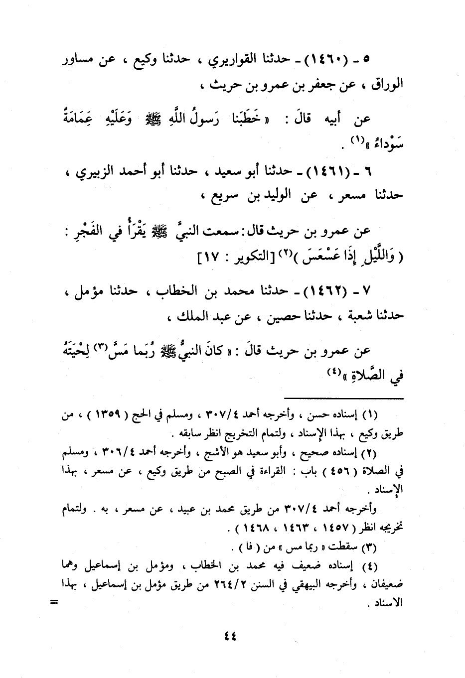 1461 - حَدَّثَنَا أَبُو سَعِيدٍ، حَدَّثَنَا أَبُو أَحْمَدَ الزُّبَيْرِيُّ، حَدَّثَنَا مِسْعَرٌ، عَنِ الْوَلِيدِ بْنِ سَرِيعٍ، عَنْ عَمْرِو بْنِ حُرَيْثٍ، قَالَ: سَمِعْتُ النَّبِيَّ صَلَّى اللهُ عَلَيْهِ وَسَلَّمَ §يَقْرَأُ فِي الْفَجْرِ وَاللَّيْلِ إِذَا عَسْعَسَ "Kإسناده صحيح