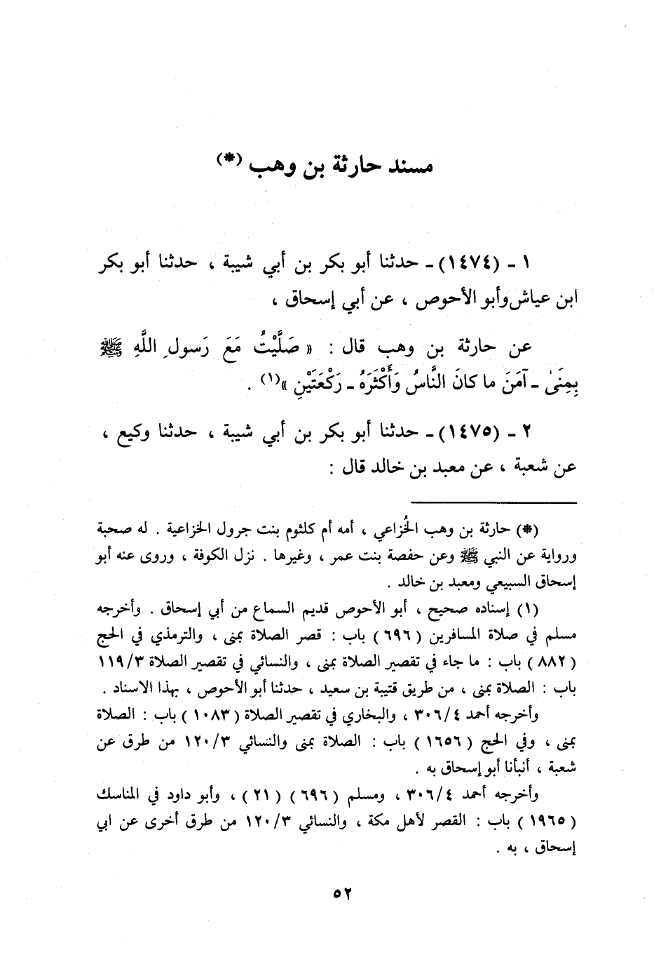 1474 - حَدَّثَنَا أَبُو بَكْرِ بْنُ أَبِي شَيْبَةَ، حَدَّثَنَا أَبُو بَكْرِ بْنُ عَيَّاشٍ، وَأَبُو الْأَحْوَصِ، عَنْ أَبِي إِسْحَاقَ، عَنْ حَارِثَةَ بْنِ وَهْبٍ، قَالَ: «§صَلَّيْتُ مَعَ رَسُولِ اللَّهِ صَلَّى اللهُ عَلَيْهِ وَسَلَّمَ بِمِنْى - آمَنَ مَا كَانَ النَّاسُ وَأَكْثَرَهُ - رَكْعَتَيْنِ» Kإسناده صحيح