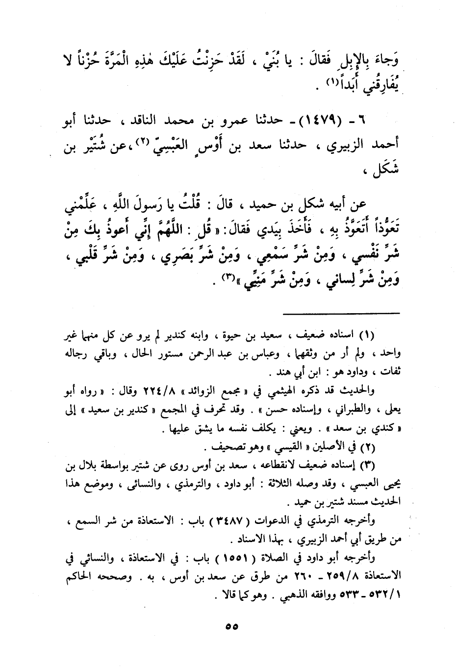 1479 - حَدَّثَنَا عَمْرُو بْنُ مُحَمَّدٍ النَّاقِدُ، حَدَّثَنَا أَبُو أَحْمَدَ الزُّبَيْرِيُّ، حَدَّثَنَا سَعْدُ بْنُ أَوْسٍ الْعَبْسِيُّ، عَنْ شُتَيْرِ بْنِ شَكَلٍ، عَنْ أَبِيهِ شَكَلِ بْنِ حُمَيْدٍ قَالَ: قُلْتُ: يَا رَسُولَ اللَّهِ، عَلِّمْنِي تَعَوُّذًا أَتَعَوَّذُ بِهِ، فَأَخَذَ بِيَدِي، فَقَالَ: " §قُلِ: اللَّهُمَّ إِنِّي أَعُوذُ بِكَ مِنْ شَرِّ نَفْسِي، وَمِنْ شَرِّ سَمْعِي، وَمِنْ شَرِّ بَصَرِي، وَمِنْ شَرِّ قَلْبِي، وَمِنْ شَرِّ لِسَانِي، وَمِنْ شَرِّ مَنِيِّي "Kإسناده ضعيف لانقطاعه