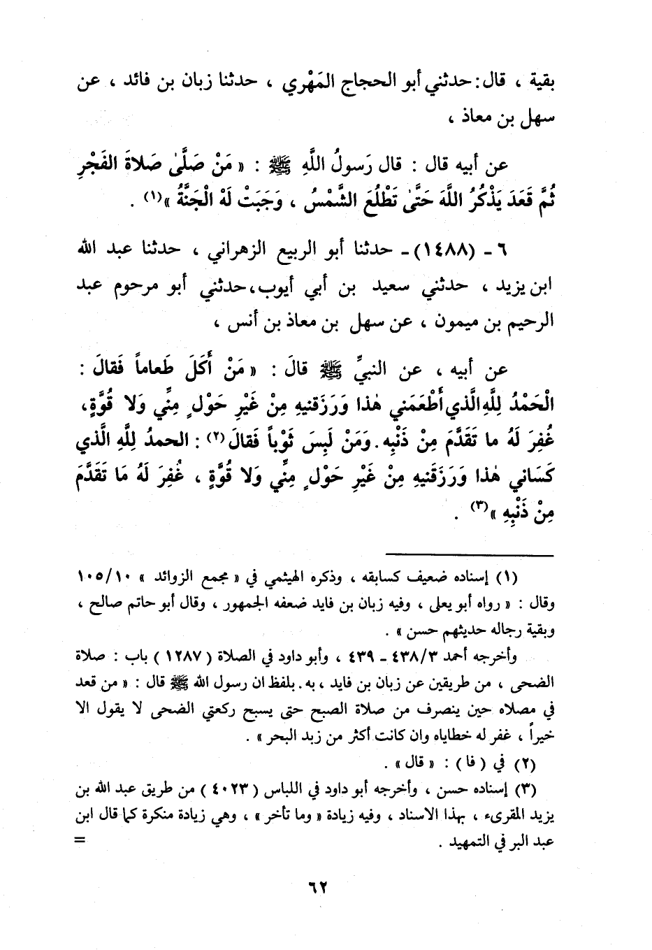 1488 - حَدَّثَنَا أَبُو الرَّبِيعِ الزَّهْرَانِيُّ، حَدَّثَنَا عَبْدُ اللَّهِ بْنُ يَزِيدَ، حَدَّثَنِي سَعِيدُ بْنُ أَبِي أَيُّوبَ، حَدَّثَنِي أَبُو مَرْحُومٍ عَبْدُ الرَّحِيمِ بْنُ مَيْمُونٍ، عَنْ سَهْلِ بْنِ مُعَاذِ بْنِ أَنَسٍ، عَنْ أَبِيهِ، عَنِ النَّبِيِّ صَلَّى اللهُ عَلَيْهِ وَسَلَّمَ قَالَ: " §مَنْ أَكَلَ طَعَامًا، فَقَالَ: الْحَمْدُ لِلَّهِ الَّذِي أَطْعَمَنِي هَذَا وَرَزَقَنِيهِ مِنْ غَيْرِ حَوْلٍ مِنِّي، وَلَا قُوَّةٍ غُفِرَ لَهُ مَا تَقَدَّمَ مِنْ ذَنْبِهِ، وَمَنْ لَبِسَ ثَوْبًا، فَقَالَ: الْحَمْدُ لِلَّهِ الَّذِي كَسَانِي هَذَا وَرَزَقَنِيهِ مِنْ غَيْرِ حَوْلٍ مِنِّي، وَلَا قُوَّةٍ غُفِرَ لَهُ مَا تَقَدَّمَ مِنْ ذَنْبِهِ "Kإسناده حسن