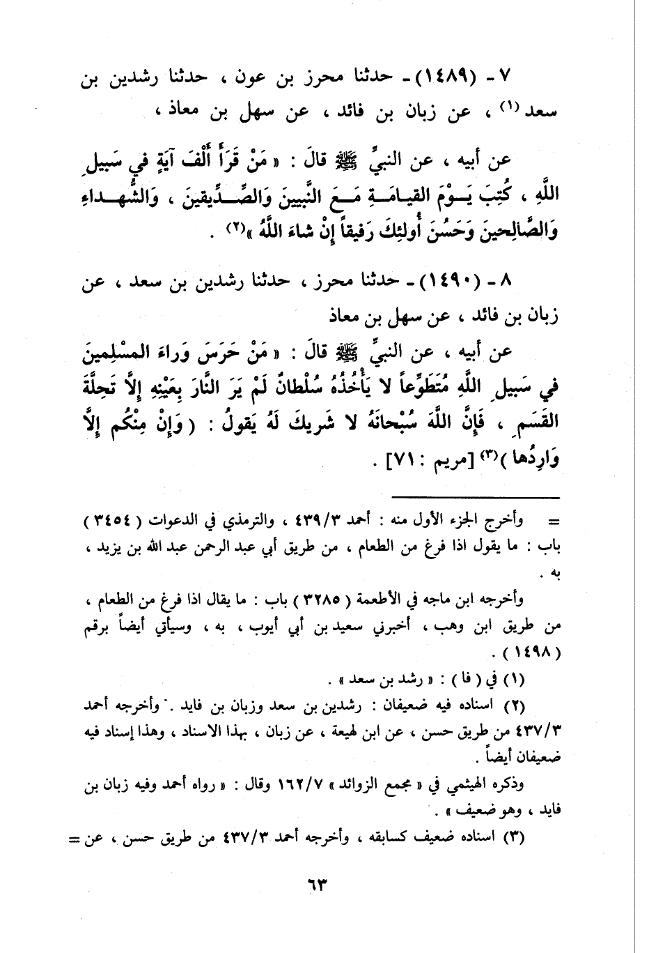 1489 - حَدَّثَنَا مُحْرِزُ بْنُ عَوْنٍ، حَدَّثَنَا رِشْدِينُ بْنُ سَعْدٍ، عَنْ زَبَّانَ بْنِ فَائِدٍ، عَنْ سَهْلِ بْنِ مُعَاذٍ، عَنْ أَبِيهِ، عَنِ النَّبِيِّ صَلَّى اللهُ عَلَيْهِ وَسَلَّمَ قَالَ: «§مَنْ قَرَأَ أَلْفَ آيَةٍ فِي سَبِيلِ اللَّهِ، كُتِبَ يَوْمَ الْقِيَامَةِ مَعَ النَّبِيِّينَ وَالصِّدِّيقِينَ وَالشُّهَدَاءِ وَالصَّالِحِينَ وَحَسُنَ أُولَئِكَ رَفِيقًا إِنْ شَاءَ اللَّهُ» Kإسناده فيه ضعيفان