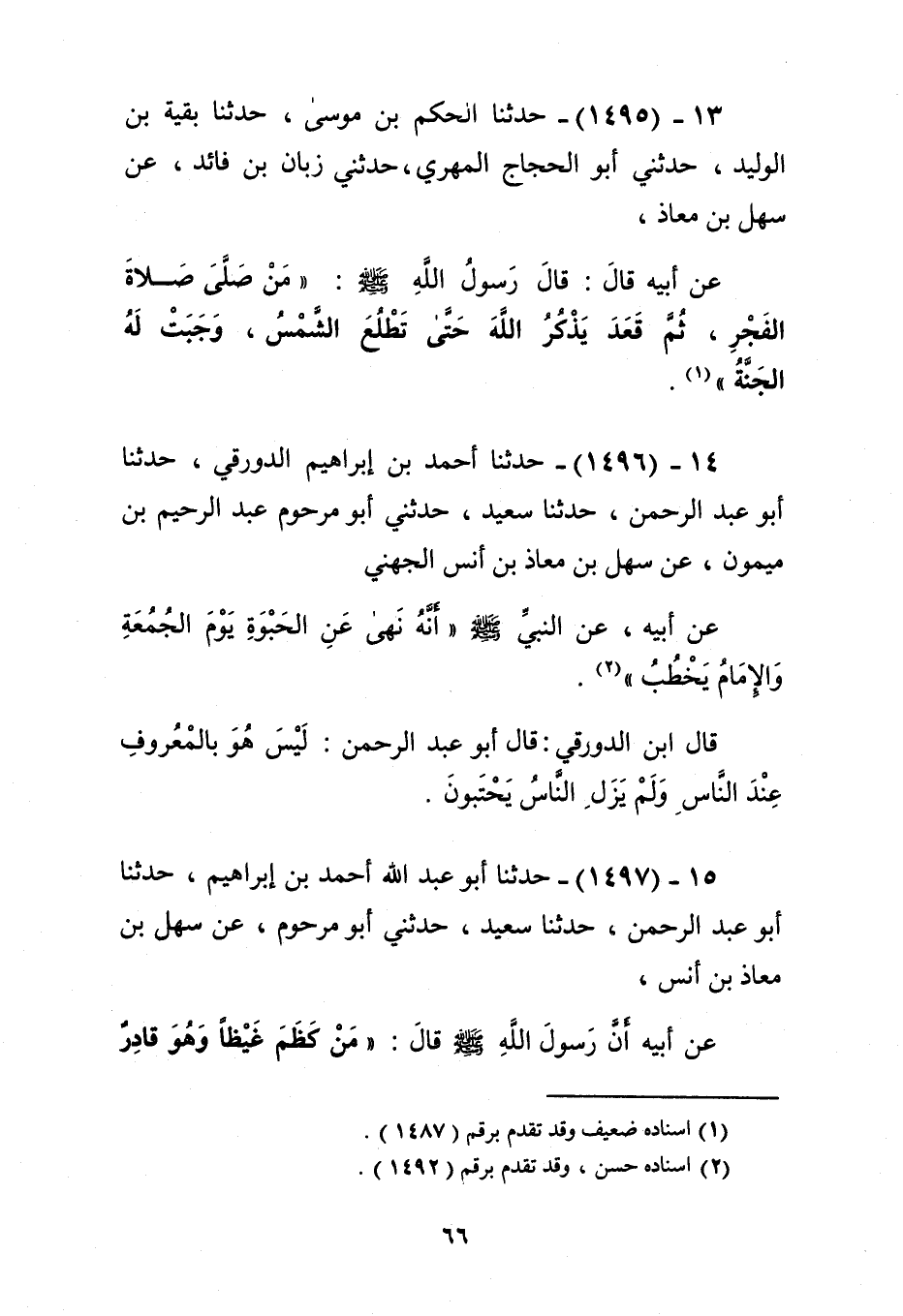 1495 - حَدَّثَنَا الْحَكَمُ بْنُ مُوسَى، حَدَّثَنَا بَقِيَّةُ بْنُ الْوَلِيدِ، حَدَّثَنِي أَبُو الْحَجَّاجِ الْمَهْرِيُّ، حَدَّثَنِي زَبَّانُ بْنُ فَائِدٍ، عَنْ سَهْلِ بْنِ مُعَاذٍ، عَنْ أَبِيهِ، قَالَ: قَالَ رَسُولُ اللَّهِ صَلَّى اللهُ عَلَيْهِ وَسَلَّمَ: «§مَنْ صَلَّى صَلَاةَ الْفَجْرِ، ثُمَّ قَعَدَ يَذْكُرُ اللَّهَ حَتَّى تَطْلُعَ الشَّمْسُ وَجَبَتْ لَهُ الْجَنَّةُ» Kإسناده ضعيف