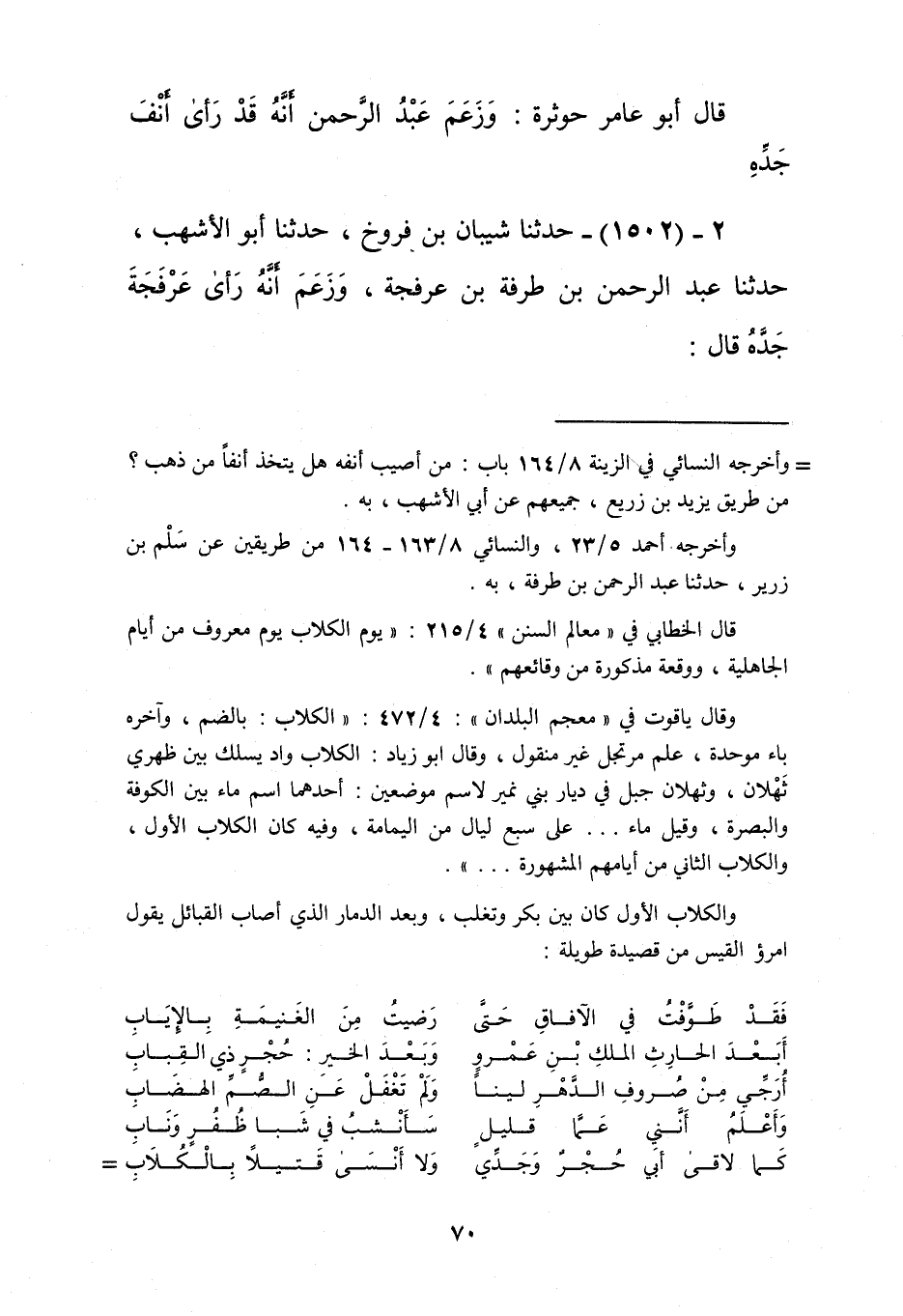 1502 - حَدَّثَنَا شَيْبَانُ بْنُ فَرُّوخٍ، حَدَّثَنَا أَبُو الْأَشْهَبِ، حَدَّثَنَا عَبْدُ الرَّحْمَنِ بْنُ طَرْفَةَ بْنِ عَرْفَجَةَ، وَزَعَمَ أَنَّهُ رَأَى عَرْفَجَةَ جَدَّهُ قَالَ -[71]-: أُصِيبَ أَنْفُ عَرْفَجَةَ يَوْمَ الْكُلَابِ، فَاتَّخَذَ أَنْفًا مِنْ وَرَقٍ فَأَنْتَنَ عَلَيْهِ، §فَأَمَرَهُ النَّبِيُّ صَلَّى اللهُ عَلَيْهِ وَسَلَّمَ أَنْ يَتَّخِذَ أَنْفًا مِنْ ذَهَبٍ "Kإسناده حسن