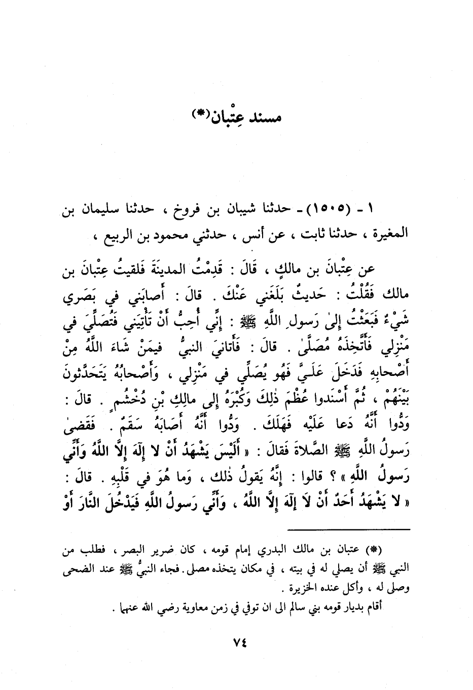 1505 - حَدَّثَنَا شَيْبَانُ بْنُ فَرُّوخٍ، حَدَّثَنَا سُلَيْمَانُ بْنُ الْمُغِيرَةِ، حَدَّثَنَا ثَابِتٌ، عَنْ أَنَسٍ، حَدَّثَنِي مَحْمُودُ بْنُ الرَّبِيعِ، عَنْ عِتْبَانَ بْنِ مَالِكٍ، قَالَ: قَدِمْتُ الْمَدِينَةَ فَلَقِيتُ عِتْبَانَ بْنَ مَالِكٍ، فَقُلْتُ: حَدِيثٌ بَلَغَنِي عَنْكَ، قَالَ: أَصَابَنِي فِي بَصَرِي شَيْءٌ فَبَعَثْتُ إِلَى رَسُولِ اللَّهِ صَلَّى اللهُ عَلَيْهِ وَسَلَّمَ إِنِّي أُحِبُّ أَنْ تَأْتِيَنِي فَتُصَلِّيَ فِي مَنْزِلِي فَأَتَّخِذَهُ مُصَلًّى، قَالَ: فَأَتَانِي النَّبِيُّ فِيمَنْ شَاءَ اللَّهُ مِنْ أَصْحَابِهِ، فَدَخَلَ عَلَيَّ فَهُوَ يُصَلِّي فِي مَنْزِلِي، وَأَصْحَابُهُ يَتَحَدَّثُونَ بَيْنَهُمْ، ثُمَّ أَسْنَدُوا عُظْمَ ذَلِكَ وَكِبَرَهُ إِلَى مَالِكِ بْنِ دُخْشُمٍ، قَالَ: وَدُّوا أَنَّهُ دَعَا عَلَيْهِ فَهَلَكَ، وَدُّوا أَنَّهُ أَصَابَهُ سَقَمٌ فَقَضَى رَسُولُ اللَّهِ صَلَّى اللهُ عَلَيْهِ وَسَلَّمَ الصَّلَاةَ، فَقَالَ: «أَلَيْسَ يَشْهَدُ أَنَّ لَا إِلَهَ إِلَّا اللَّهُ، وَأَنِّي رَسُولُ اللَّهِ» قَالُوا: إِنَّهُ يَقُولُ ذَلِكَ وَمَا هُوَ فِي قَلْبِهِ، قَالَ: «§لَا يَشْهَدُ أَحَدٌ أَنَّ لَا إِلَهَ إِلَّا اللَّهُ، وَأَنِّي رَسُولُ اللَّهِ فَيَدْخُلُ النَّارَ أَوْ تَطْعَمُهُ النَّارُ» قَالَ: فَأَعْجَبَنِي هَذَا الْحَدِيثُ فَقُلْتُ: لِابْنِي اكْتُبْهُ فَكَتَبَهُ