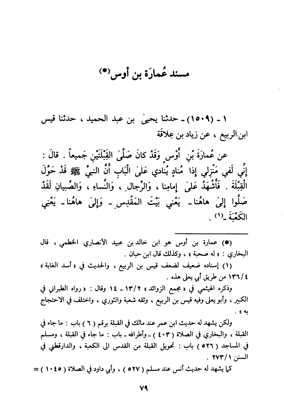 1509 - حَدَّثَنَا يَحْيَى بْنُ عَبْدِ الْحَمِيدِ، حَدَّثَنَا قَيْسُ بْنُ الرَّبِيعِ، عَنْ زِيَادِ بْنِ عِلَاقَةَ، عَنْ عُمَارَةَ بْنِ أَوْسٍ، وَقَدْ كَانَ صَلَّى الْقِبْلَتَيْنِ جَمِيعًا، قَالَ: «إِنِّي لَفِي مَنْزِلِي إِذَا مُنَادٍ يُنَادِي عَلَى الْبَابِ إِنَّ النَّبِيَّ صَلَّى اللهُ عَلَيْهِ وَسَلَّمَ §قَدْ حَوَّلَ الْقِبْلَةَ فَأَشْهَدُ عَلَى إِمَامِنَا، وَالرِّجَالِ، وَالنِّسَاءِ، وَالصِّبْيَانِ لَقَدْ صَلُّوا إِلَى هَاهُنَا - يَعْنِي بَيْتَ الْمَقْدِسِ - وَإِلَى هَاهُنَا - يَعْنِي الْكَعْبَةَ -» Kإسناده ضعيف