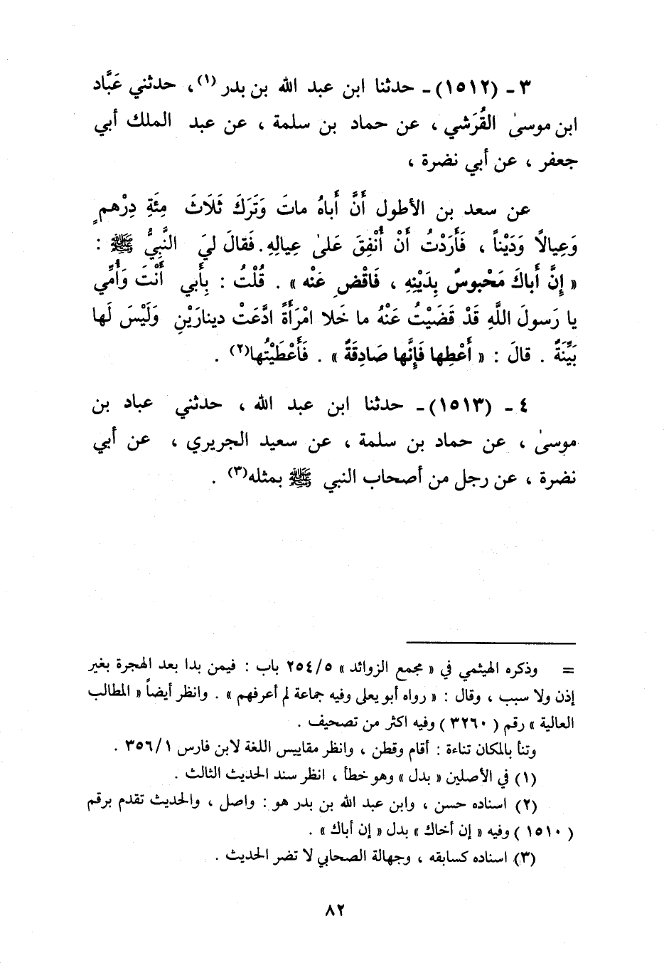 1512 - حَدَّثَنَا ابْنُ عَبْدِ اللَّهِ بْنُ بَدْرٍ، حَدَّثَنِي عَبَّادُ بْنُ مُوسَى الْقُرَشِيُّ، عَنْ حَمَّادِ بْنِ سَلَمَةَ، عَنْ عَبْدِ الْمَلِكِ أَبِي جَعْفَرٍ، عَنْ أَبِي نَضْرَةَ، عَنْ سَعْدِ بْنِ الْأَطْوَلِ، أَنَّ أَبَاهُ مَاتَ وَتَرَكَ ثَلَاثَ مِائَةِ دِرْهَمٍ وَعِيَالًا وَدَيْنًا فَأَرَدْتُ أَنْ أُنْفِقَ عَلَى عِيَالِهِ، فَقَالَ لِي النَّبِيُّ صَلَّى اللهُ عَلَيْهِ وَسَلَّمَ: «إِنَّ أَبَاكَ مَحْبُوسٌ بِدَيْنِهِ فَاقْضِ، عَنْهُ» قُلْتُ: بِأَبِي أَنْتَ وَأُمِّي يَا رَسُولَ اللَّهِ، قَدْ قَضَيْتُ، عَنْهُ مَا خَلَا امْرَأَةً ادَّعَتْ دِينَارَيْنِ، وَلَيْسَ لَهَا بَيِّنَةٌ، قَالَ: «§أَعْطِهَا فَإِنَّهَا صَادِقَةٌ فَأَعْطَيْتُهَا» Kإسناده حسن