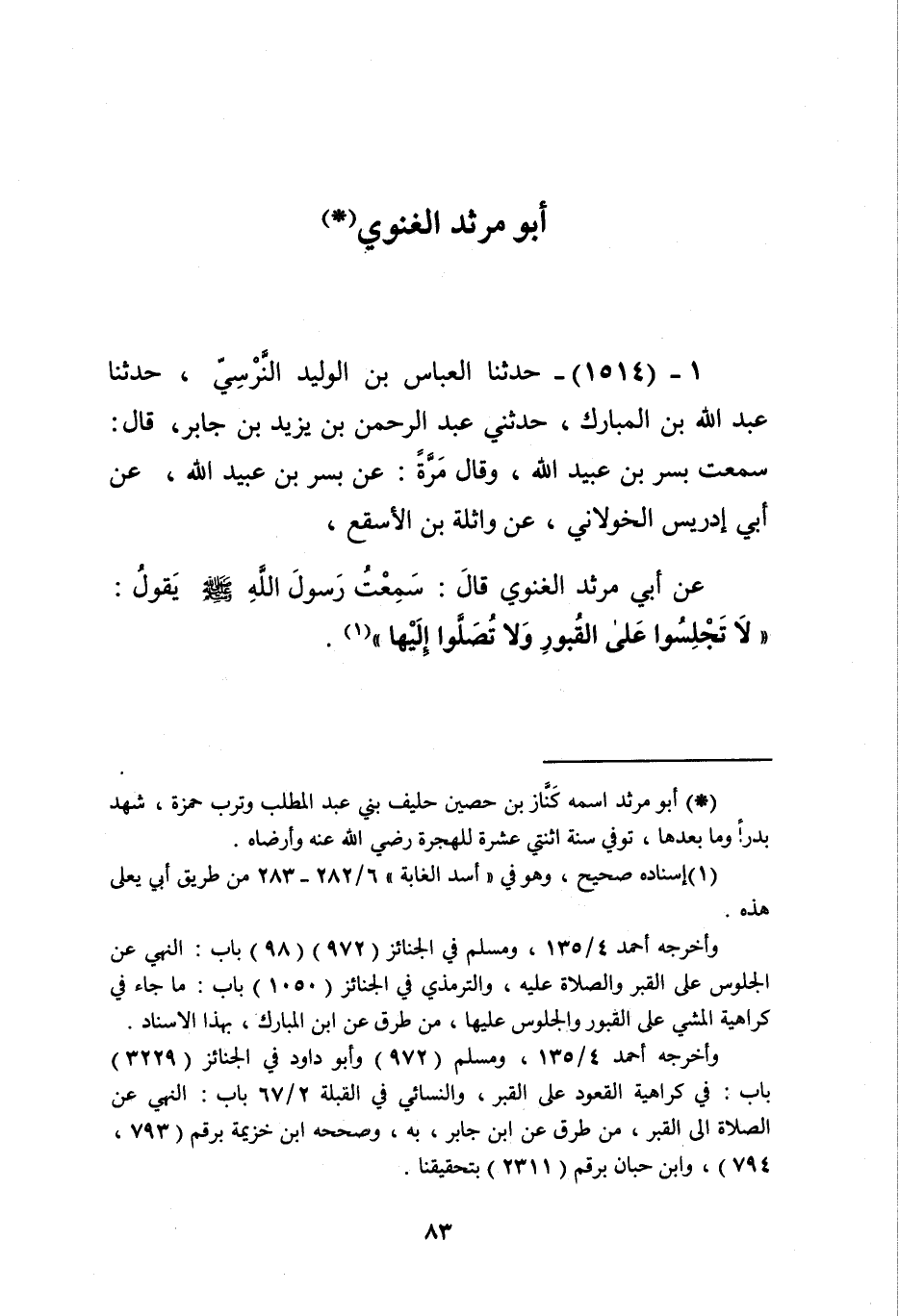 1514 - حَدَّثَنَا الْعَبَّاسُ بْنُ الْوَلِيدِ النَّرْسِيُّ، حَدَّثَنَا عَبْدُ اللَّهِ بْنُ الْمُبَارَكِ، حَدَّثَنِي عَبْدُ الرَّحْمَنِ بْنُ يَزِيدَ بْنِ جَابِرٍ، قَالَ: سَمِعْتُ بُسْرَ بْنَ عُبَيْدِ اللَّهِ، وَقَالَ مَرَّةً: عَنْ بُسْرِ بْنِ عُبَيْدِ اللَّهِ، عَنْ أَبِي إِدْرِيسَ الْخَوْلَانِيِّ، عَنْ وَاثِلَةَ بْنِ الْأَسْقَعِ، عَنْ أَبِي مَرْثَدٍ الْغَنَوِيِّ، قَالَ: سَمِعْتُ رَسُولَ اللَّهِ صَلَّى اللهُ عَلَيْهِ وَسَلَّمَ يَقُولُ: «§لَا تَجْلِسُوا عَلَى الْقُبُورِ وَلَا تُصَلُّوا إِلَيْهَا» Kإسناده صحيح